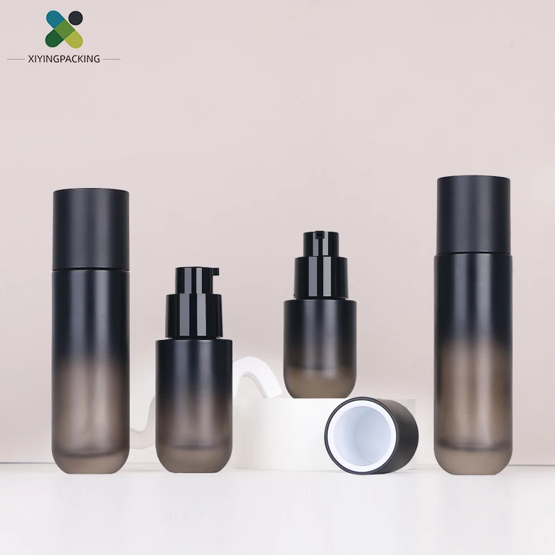 Premium Glass Skincare Cosmetic Bottle Set Gradient Black Lotion Bottle Cream Jar for Face Care Custom logo Gold Stamping