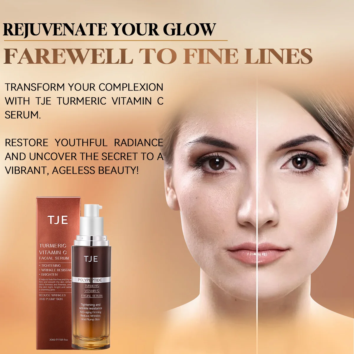 OEM/ODM Turmeric Vitamin C Facial Liquid Niacinamide Hyaluronic Acid Oligopeptides Gently Brightens Fades Fine Lines Home Use