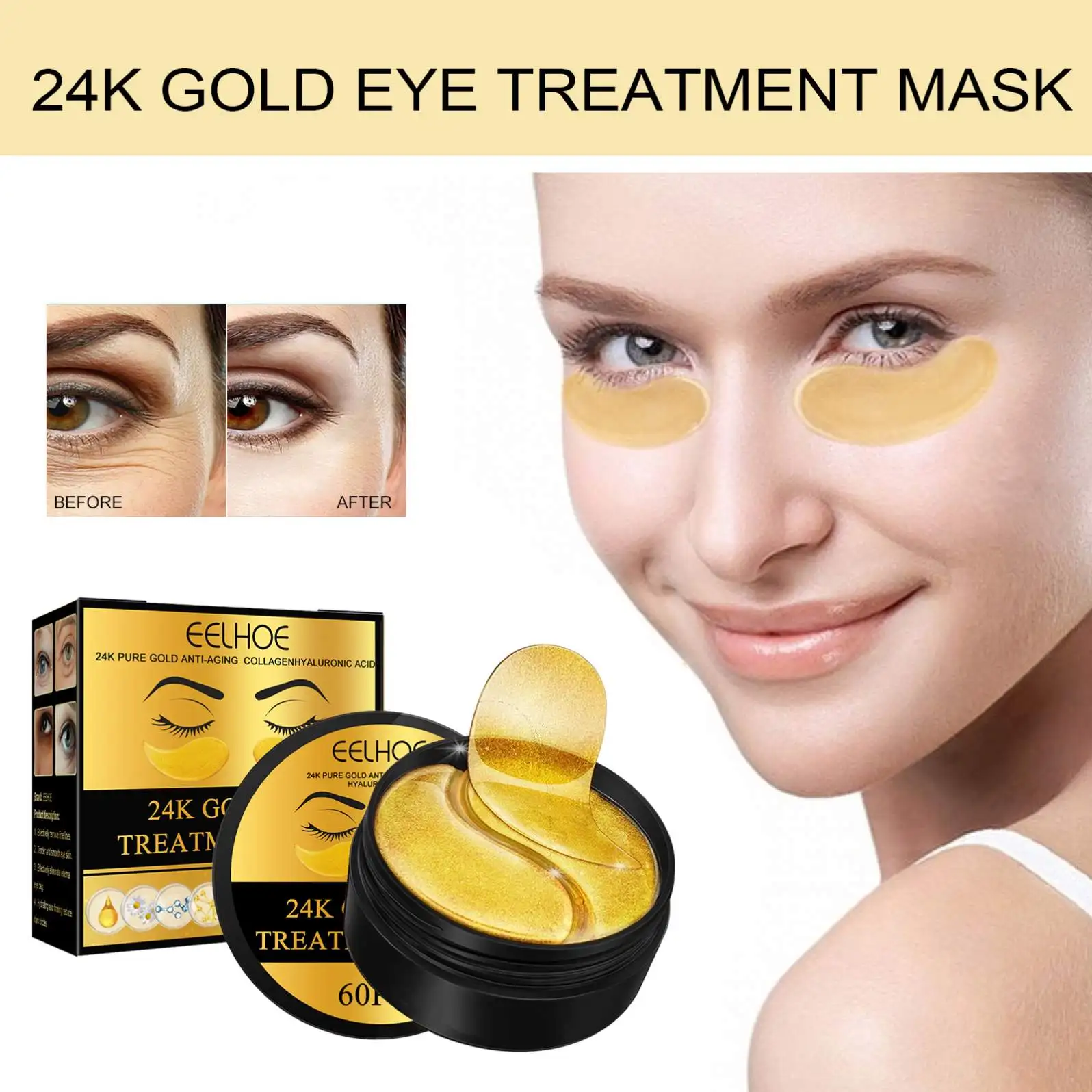 Hot Sell 24K Gold Eye Mask 24K Pur Gold Anti Aging Collagen Hyaluronic Acid Anti Wrinkle Eye Treatment Mask