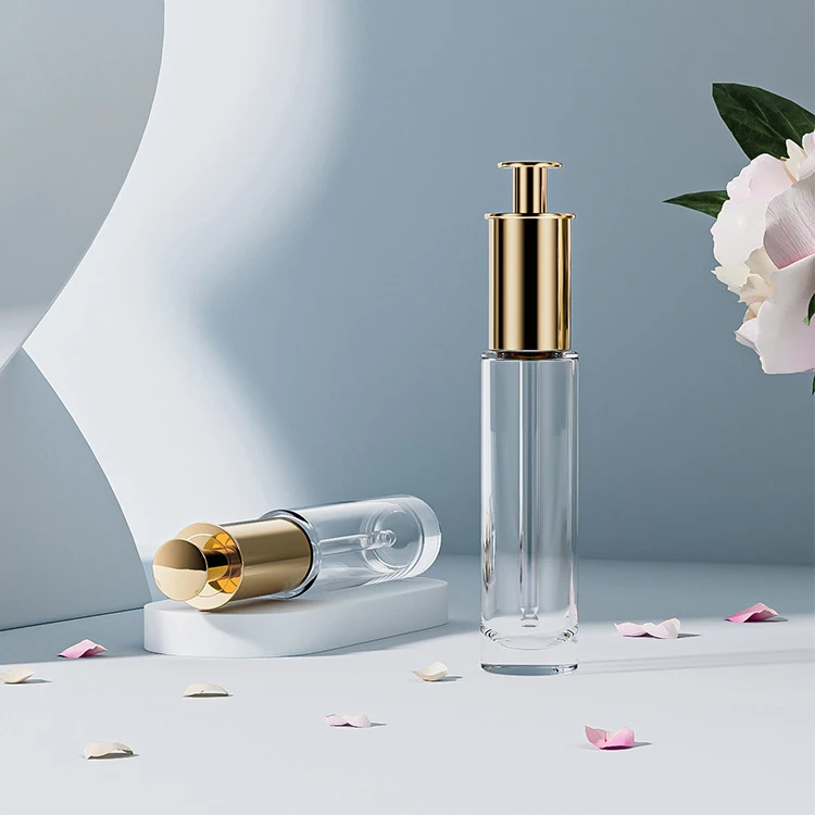 Cheap Slim Straight Round Flat Shoulder 30ml Gold Translucent Bottle With Gold Acupressure Dropper