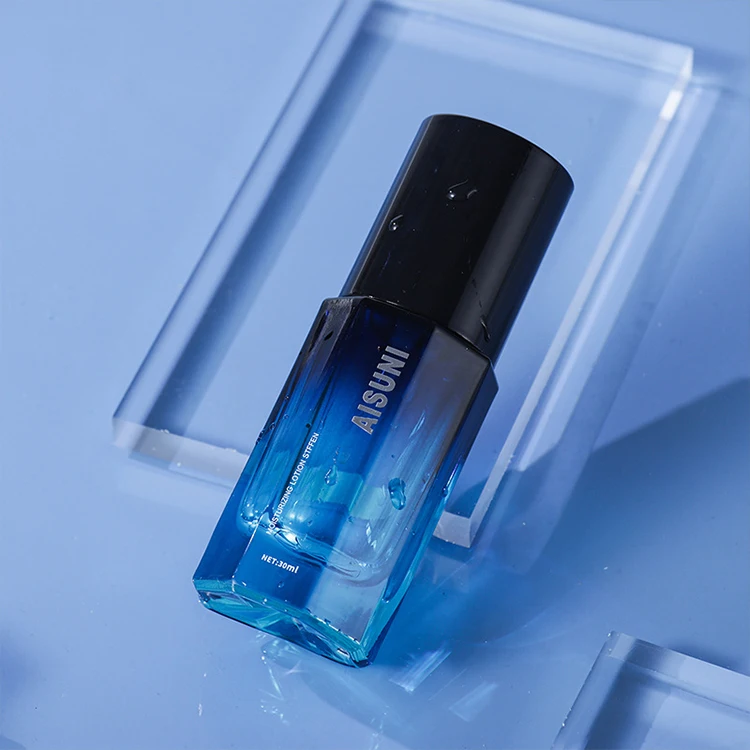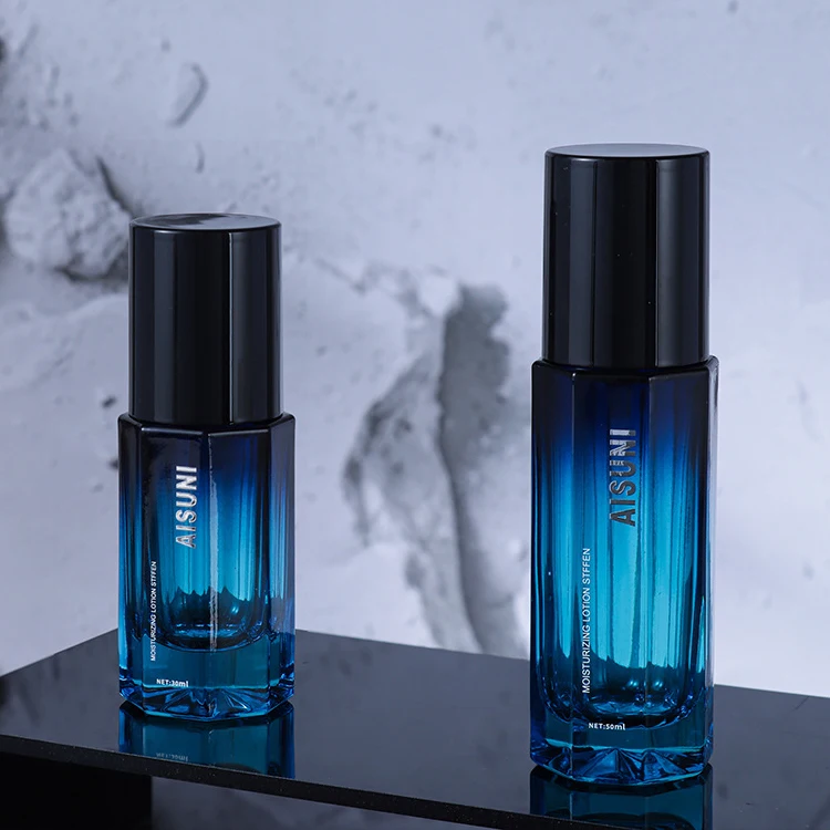 Black to Blue Transparent Gradient Octagonal Glass Bottle Suitable for High-end Men's Cosmetic Packaging