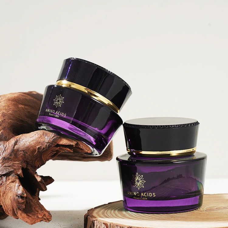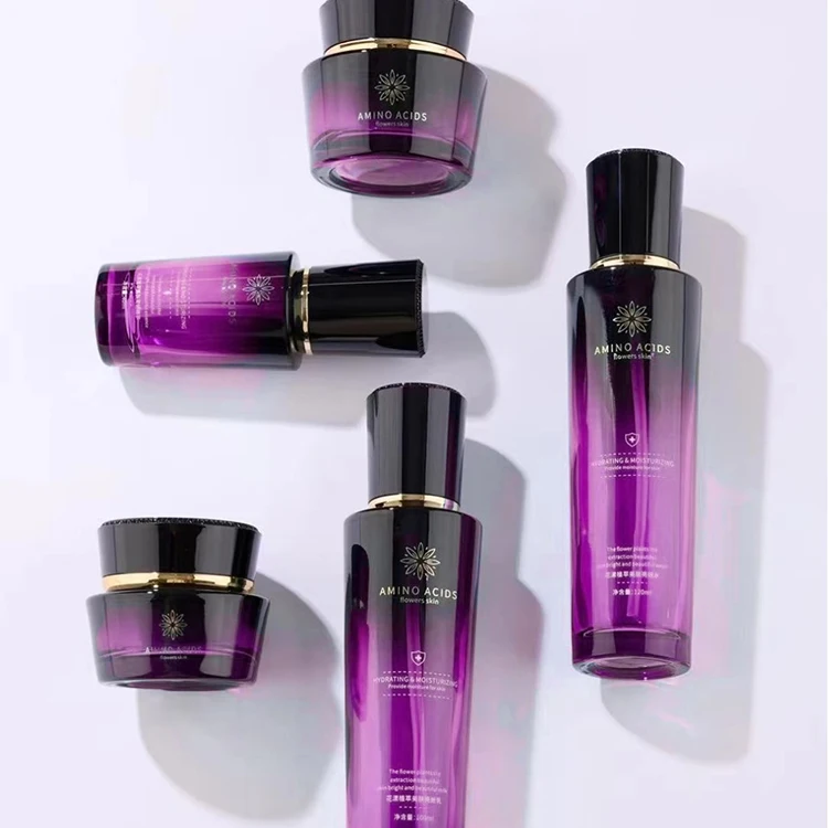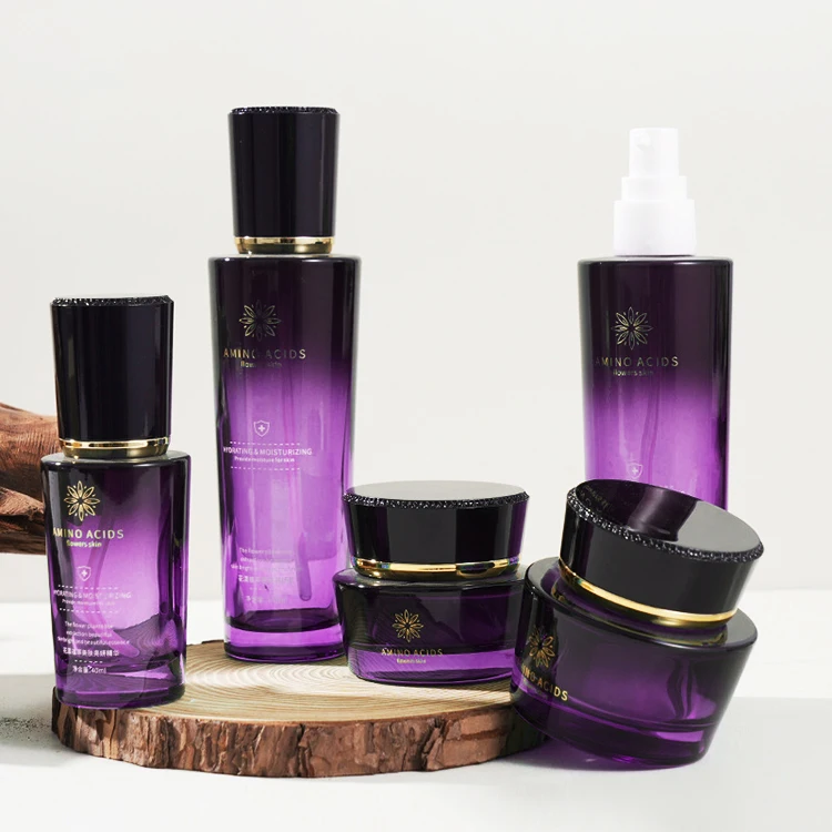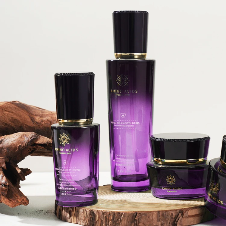 Trapezoid Cosmetic Bottle Set Black Cap Cylindrical Empty Shiny Purple Glass Jar for Skin Care Cream Face Lotion Pump Bottle