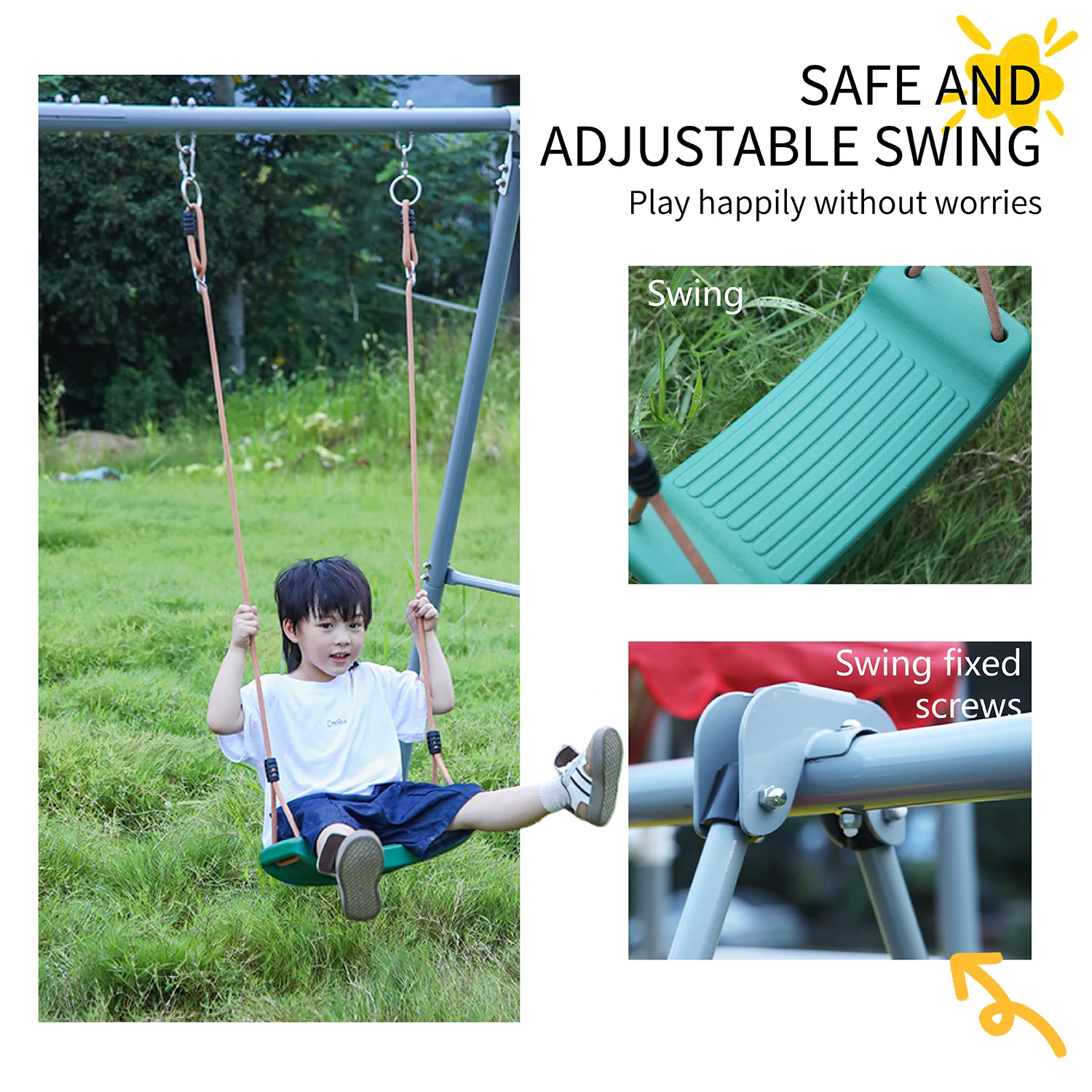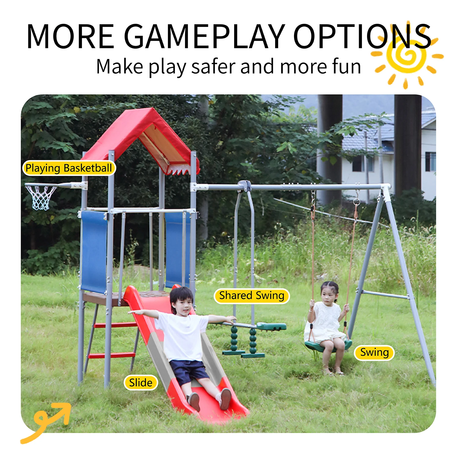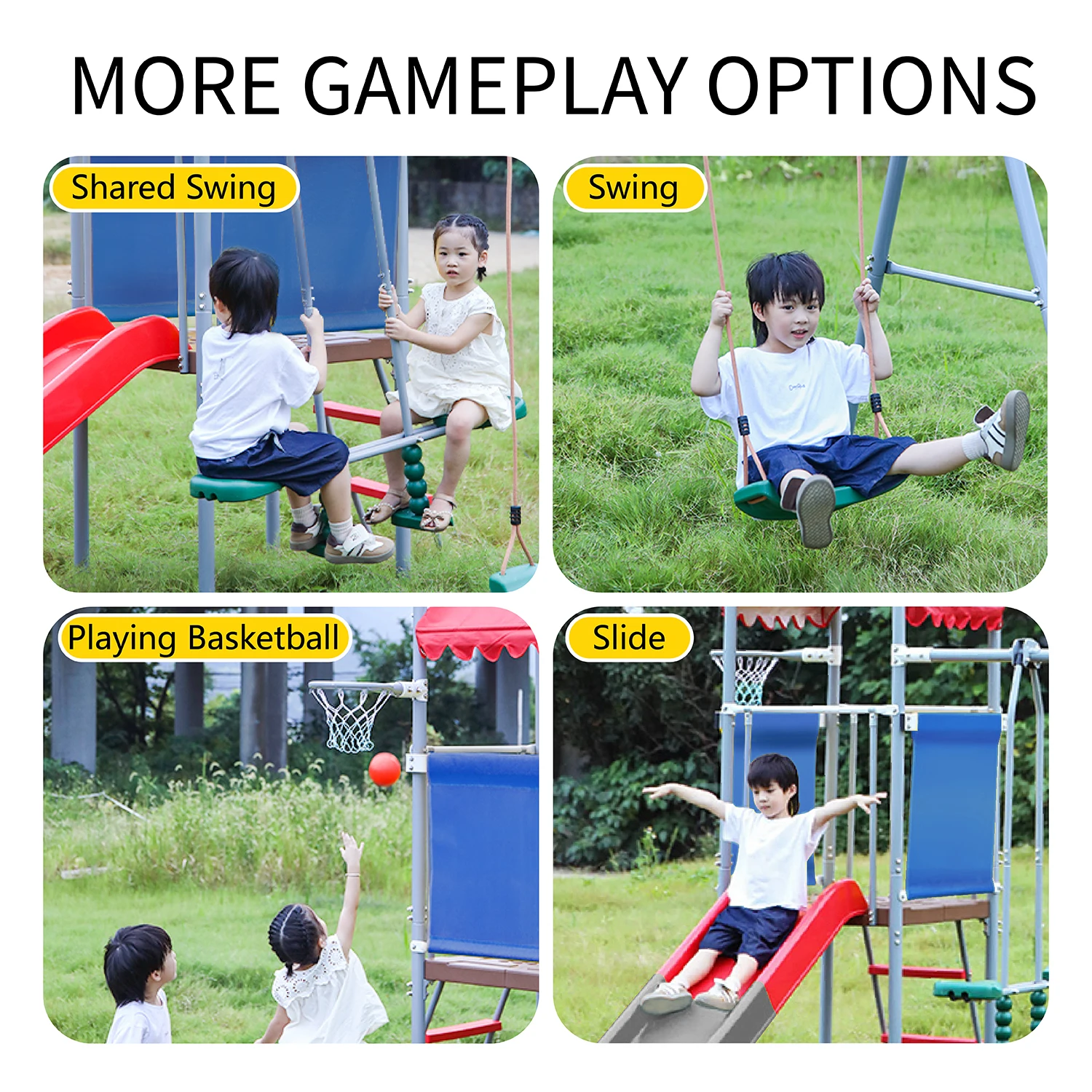 Outdoor Playground Gameplay Toddler Slide and Plastic Swing Set with Basketball Hoop Alloy Accessories Material