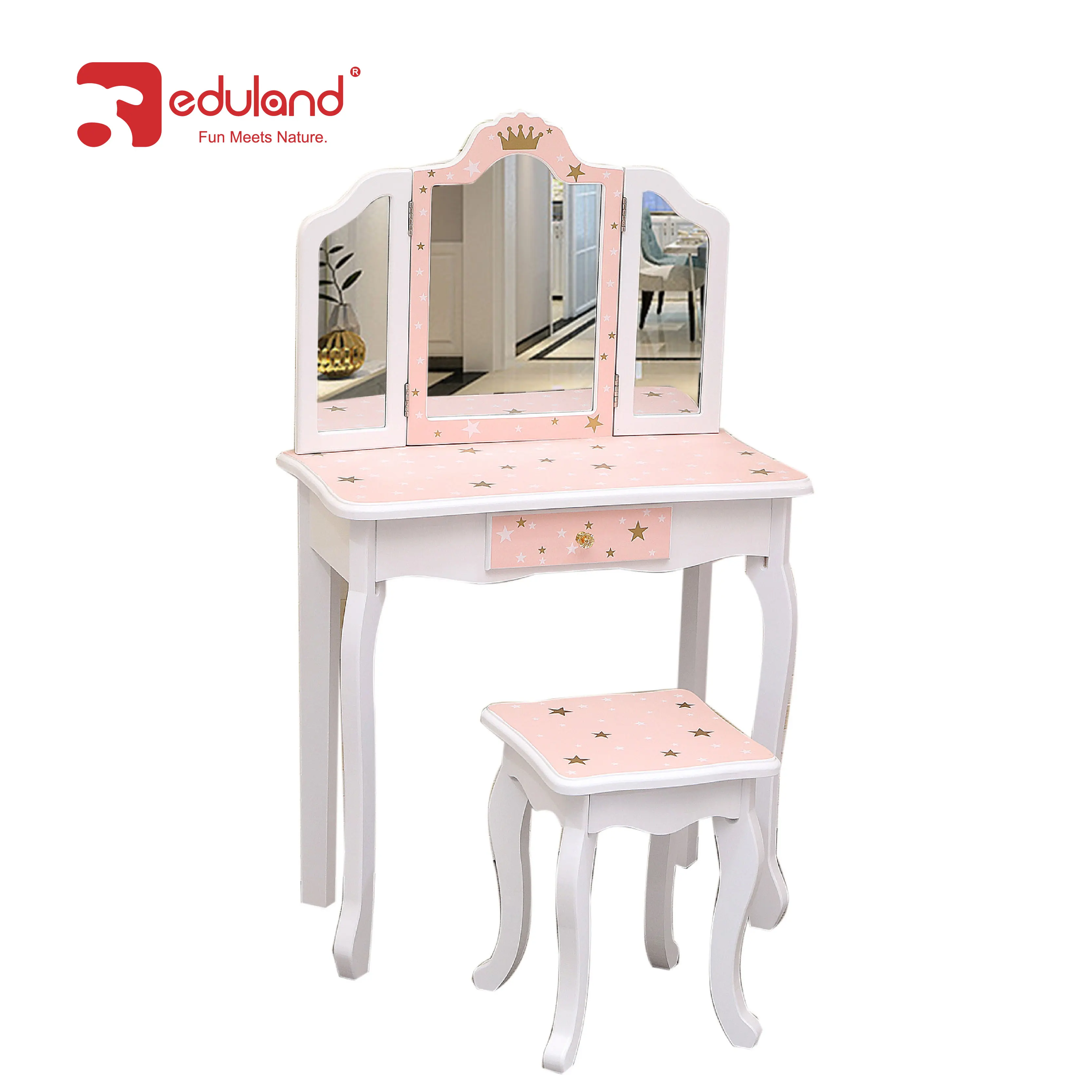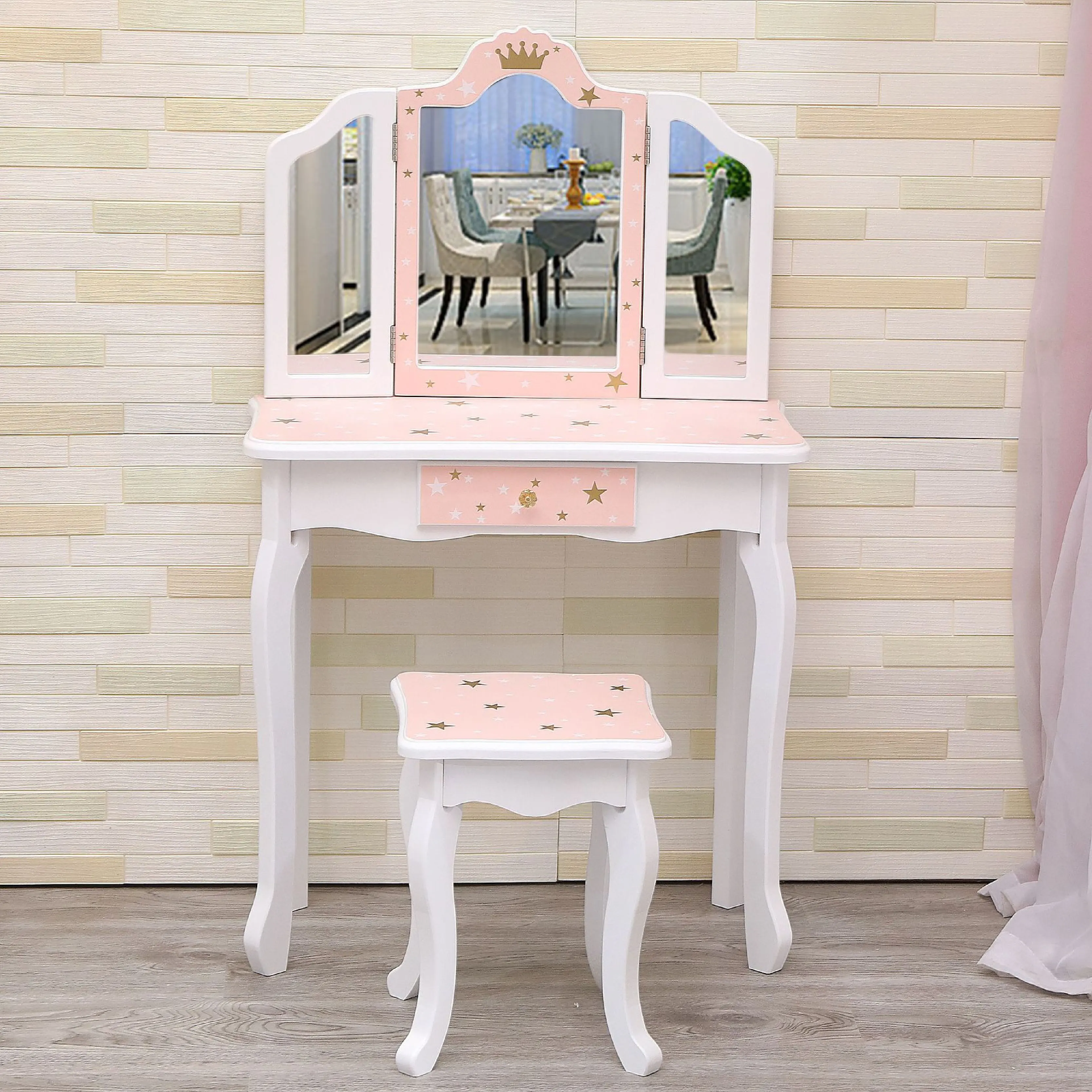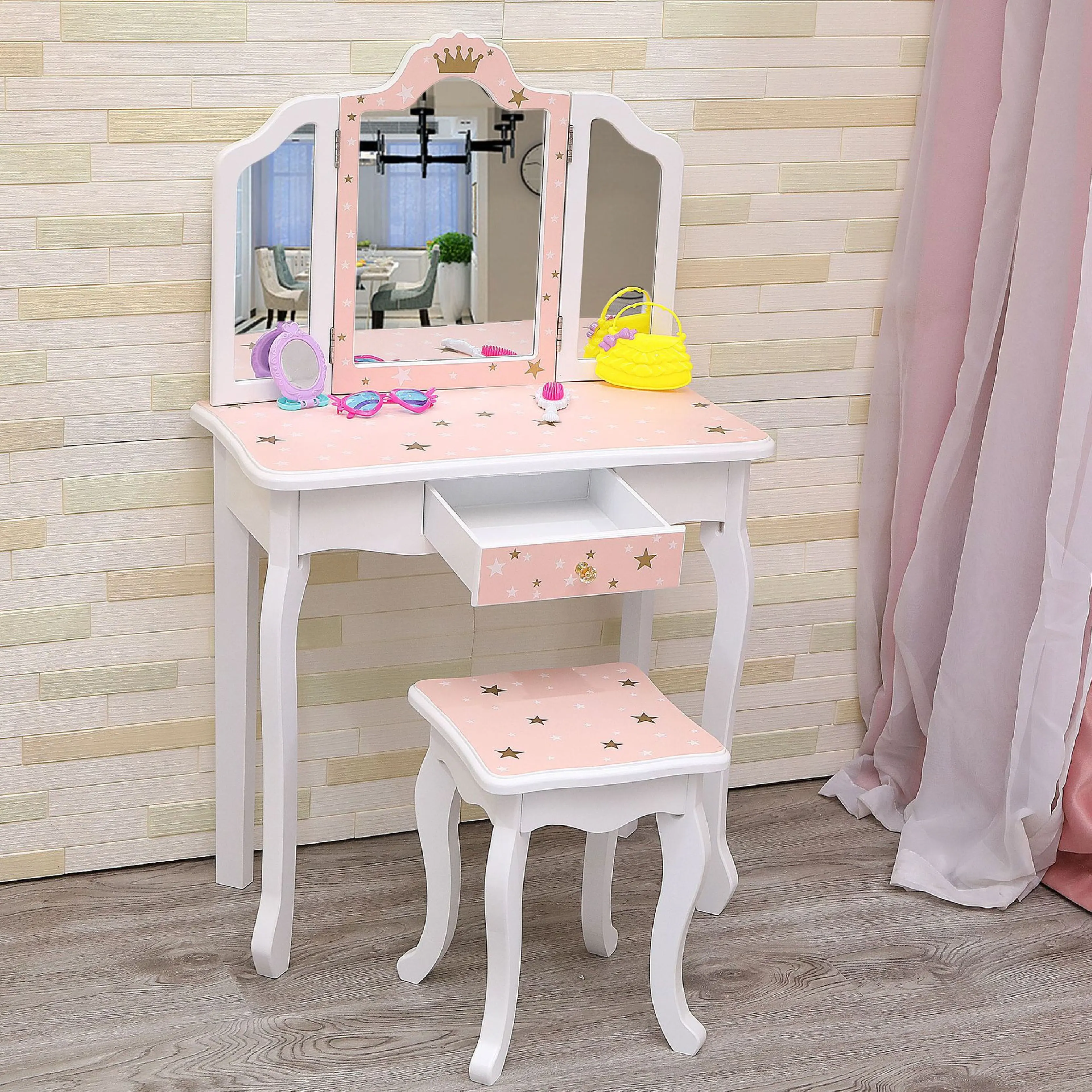 EDULAND Girls Vanity Table Chair Set Tri-Folding Mirror Makeup Dressing Princess Table Drawer Kids Pretend Play Preschool
