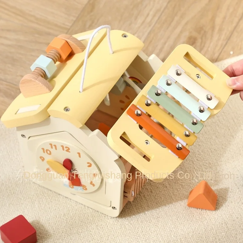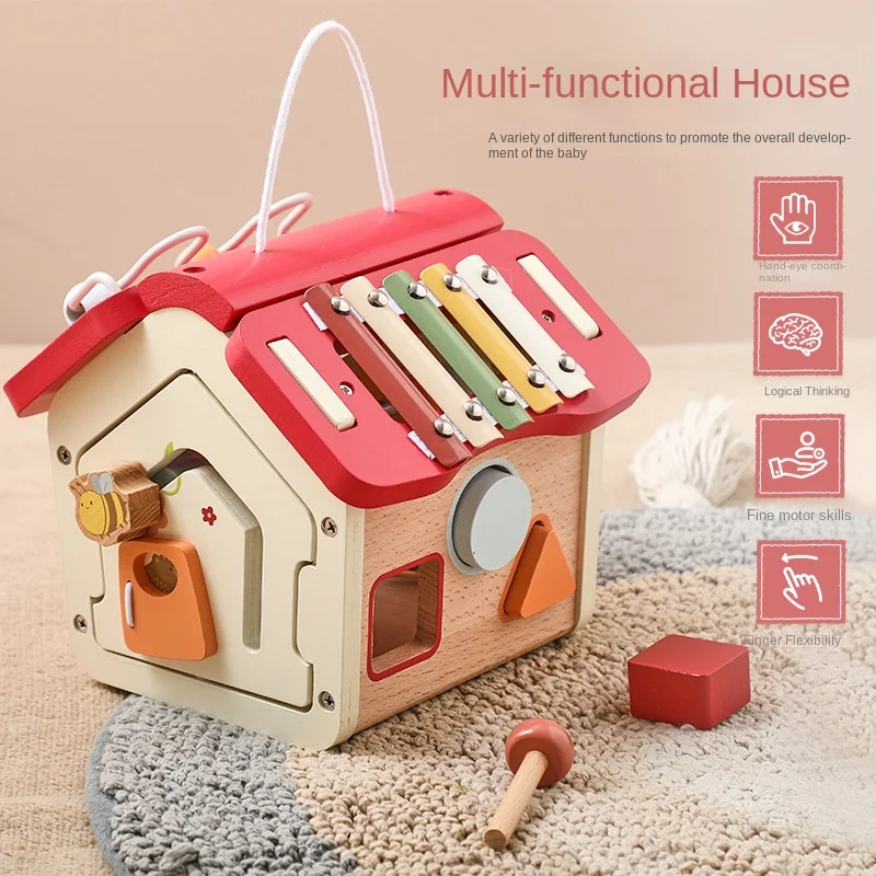 Multifunctional Wooden Knocking Toy for Baby's Early Education Children's Door Opening Shape Matching Beads Busy House Cloth