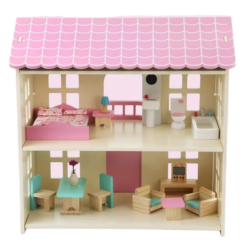 Wooden DIY Pink Castle Villa Doll House Simulates Balcony Bedroom Furniture