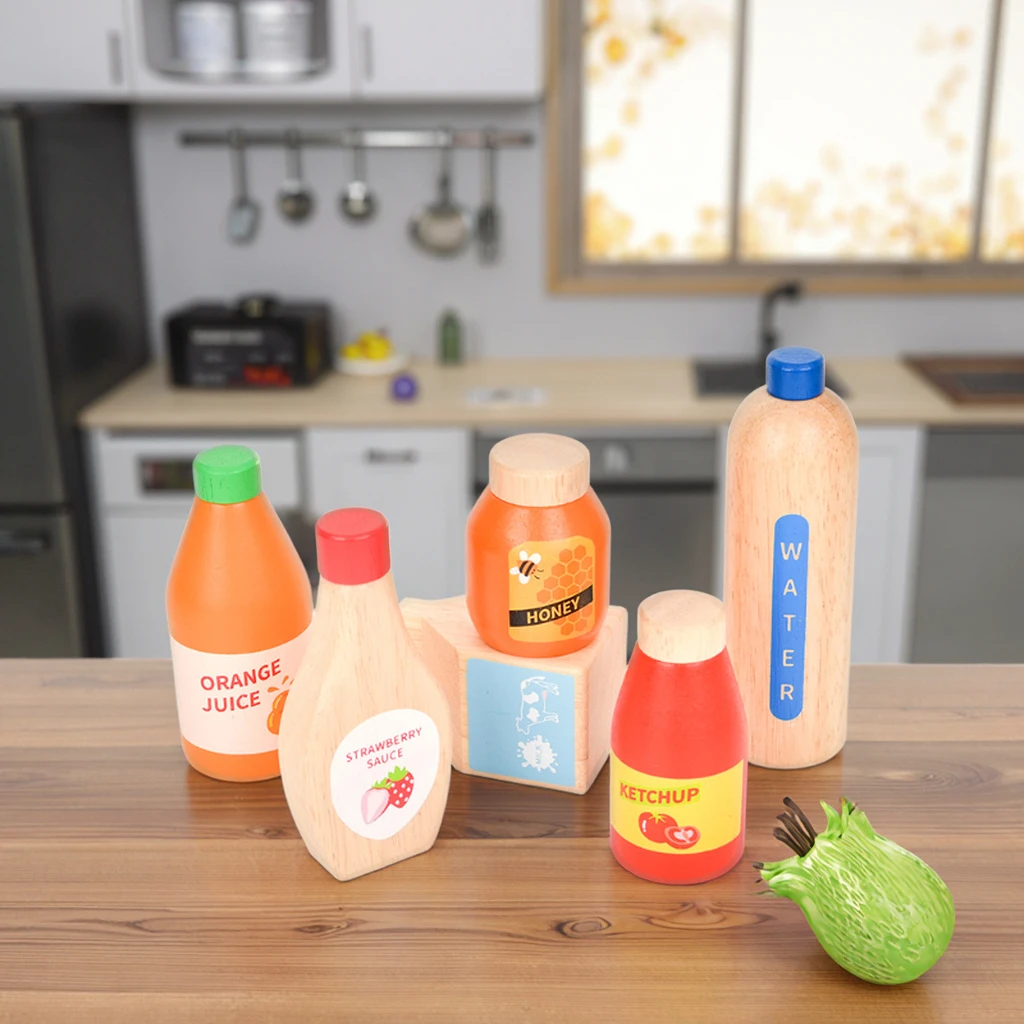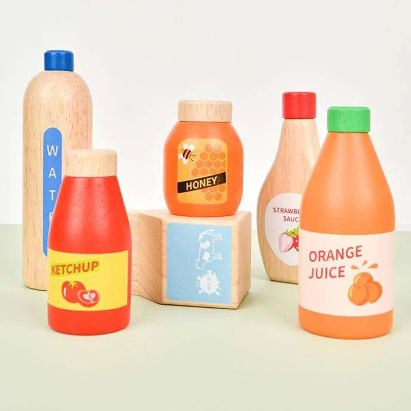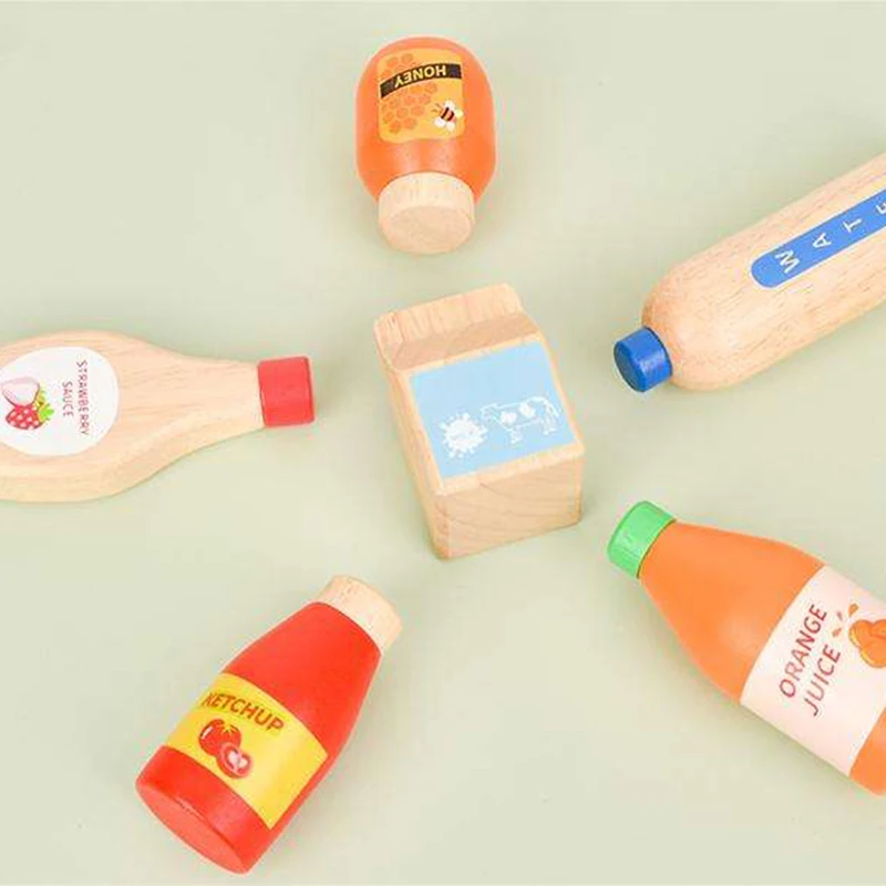 EDULAND Wooden Simulation Play Set for Preschoolers Kitchen Food Beverage Juice Bottle Building Blocks for Toddler Cooking Box