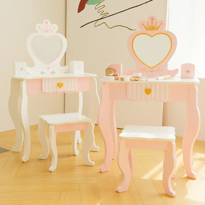 EDULAND Assembled Modern Kids Dressing Table Room Furniture Makeup Vanity Table Set with Mirror Wooden Kids Vanity Table Set