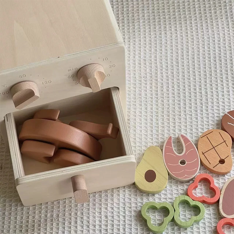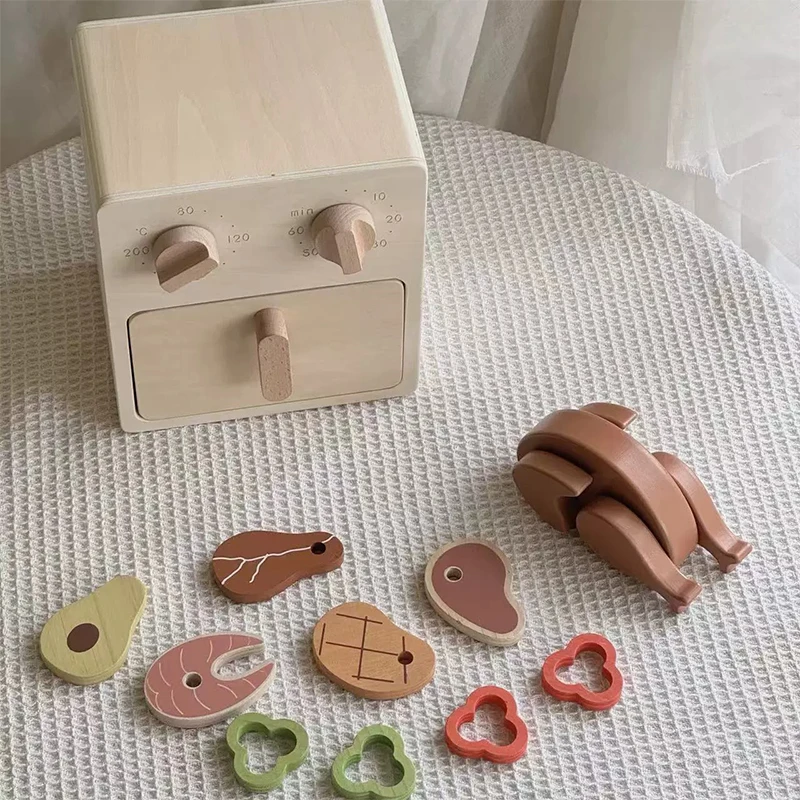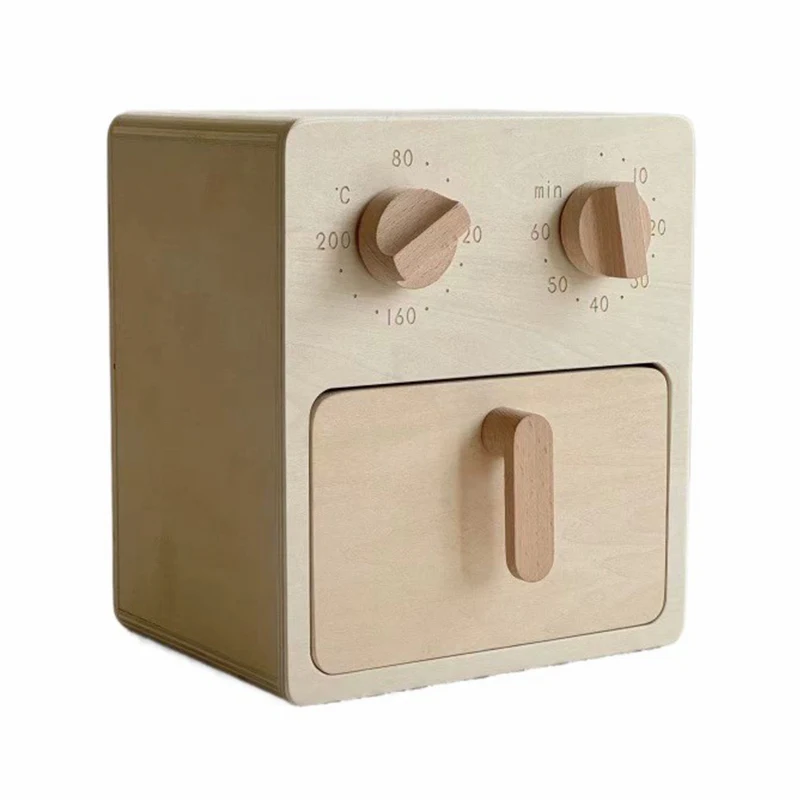 EDULAND Nordic Natural Wood Color Air Fryer Toy Children's Wooden Chicken Roasting Oven Baby House Play Set Kitchen Food Toys