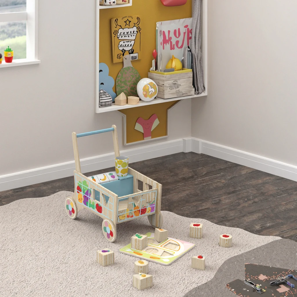 EDULAND Wooden Shape Sorting Grocery Cart Push Toy Puzzles-Pretend Play Grocery Toys Sorting Stacking Toys