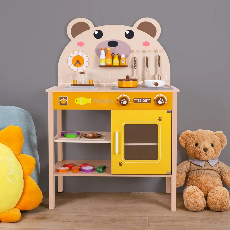 EDULAND Sound Light Simulation Wooden Bear Kitchenware Toy Set MDF Packaged Box Accessories for Home Play Refrigerator for Girls