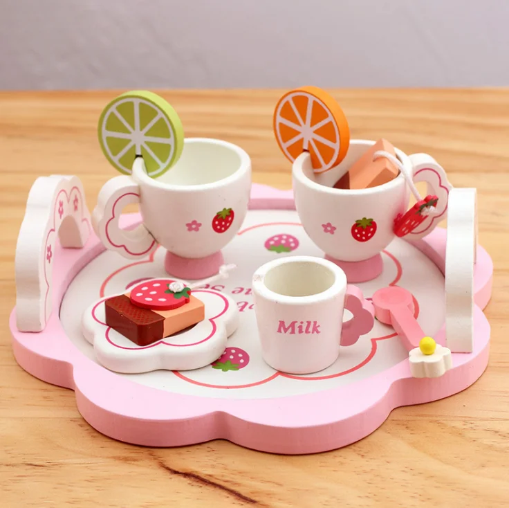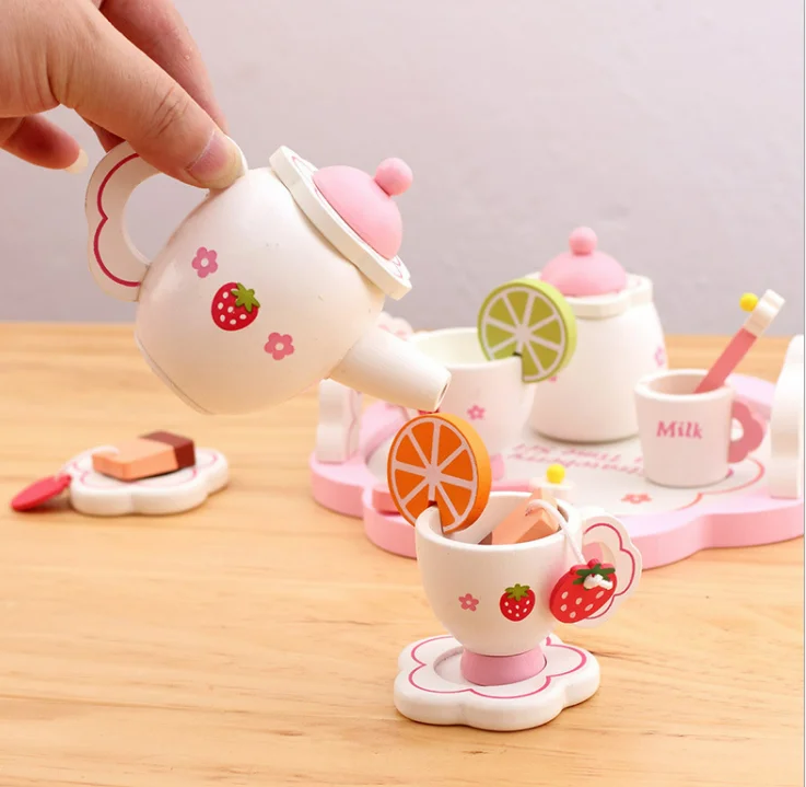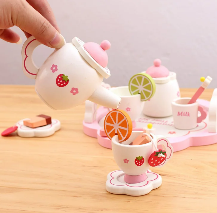 EDULAND Children's Wooden Kitchen & Food Pretend Play Tea Set Toy for Afternoon Tea Role-Play Preschool Box for Kids