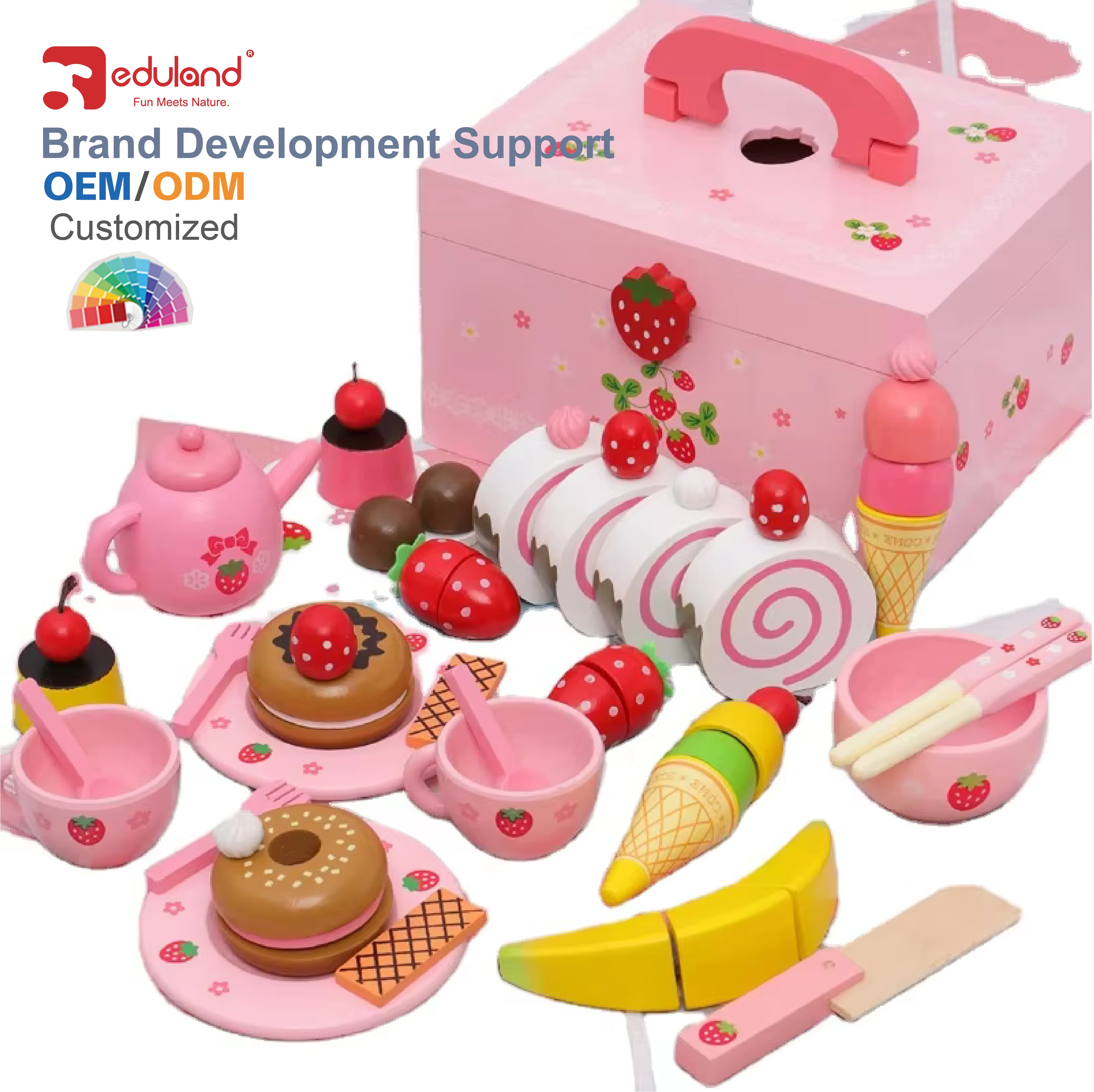 EDULAND Portable Inside Montessori Materials Strawberry Donut Party Girls Pretend Play House Wooden Dessert Cutting Kitchen Toys