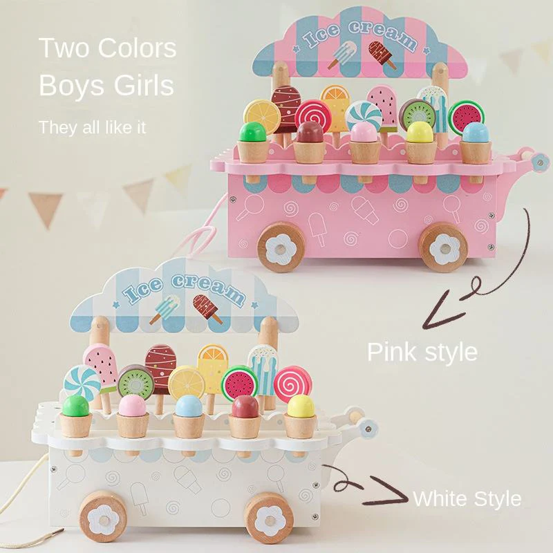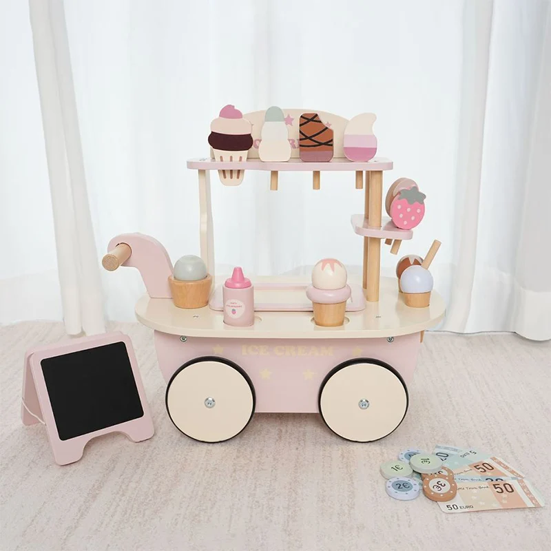 EDULAND Pretend Play Wooden Ice Cream Cart Children Simulation Dessert Shop Stand Toy Early Educational Kitchen Toys for Kids
