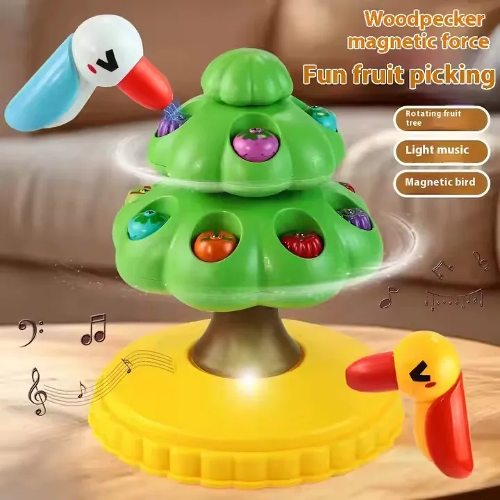 ITTL New Fun Electric Light Force Featuring Fishing Woodpecker Music Rotating Fruit Toy Set for Kids
