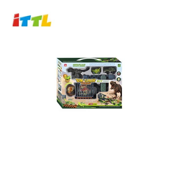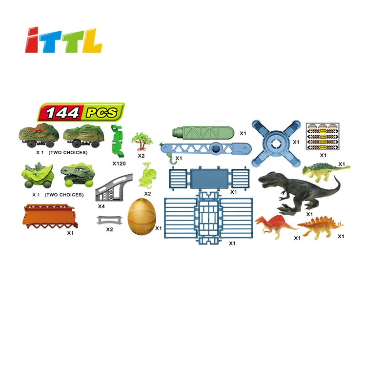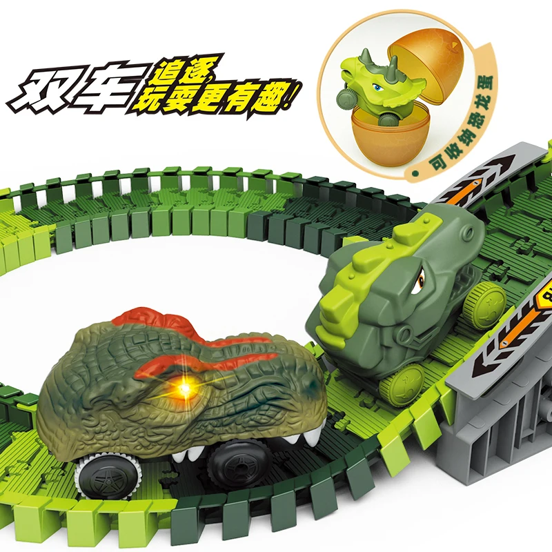 144 Pcs Electric Race Car Dinosaur Cars Track Toy Set Plastic Construction Crane Dinosaur Egg 1:20 Scale 3-A Battery Operated