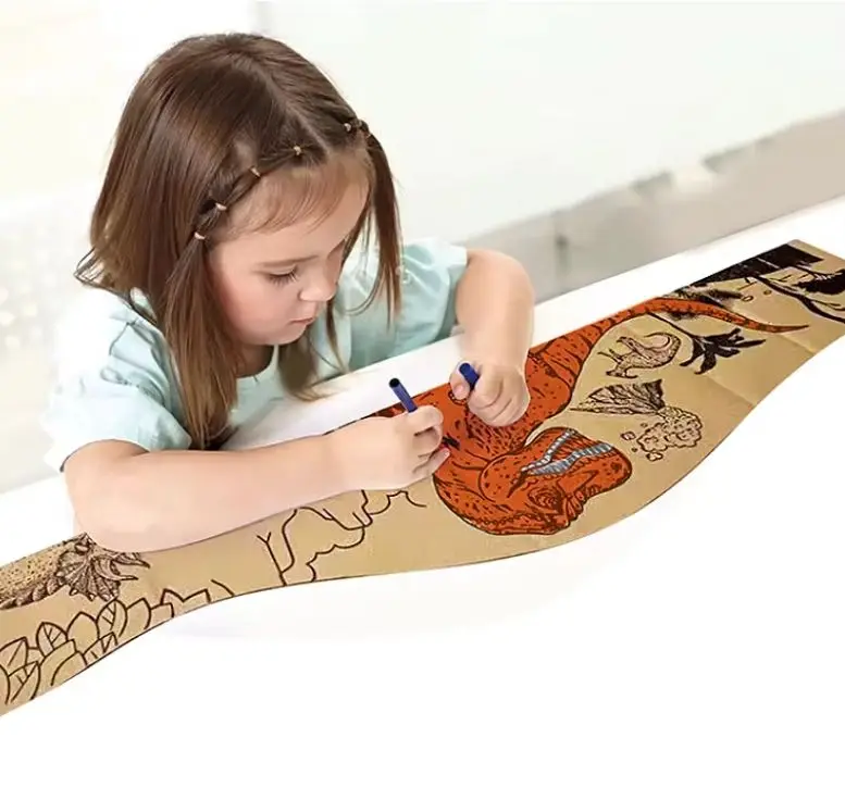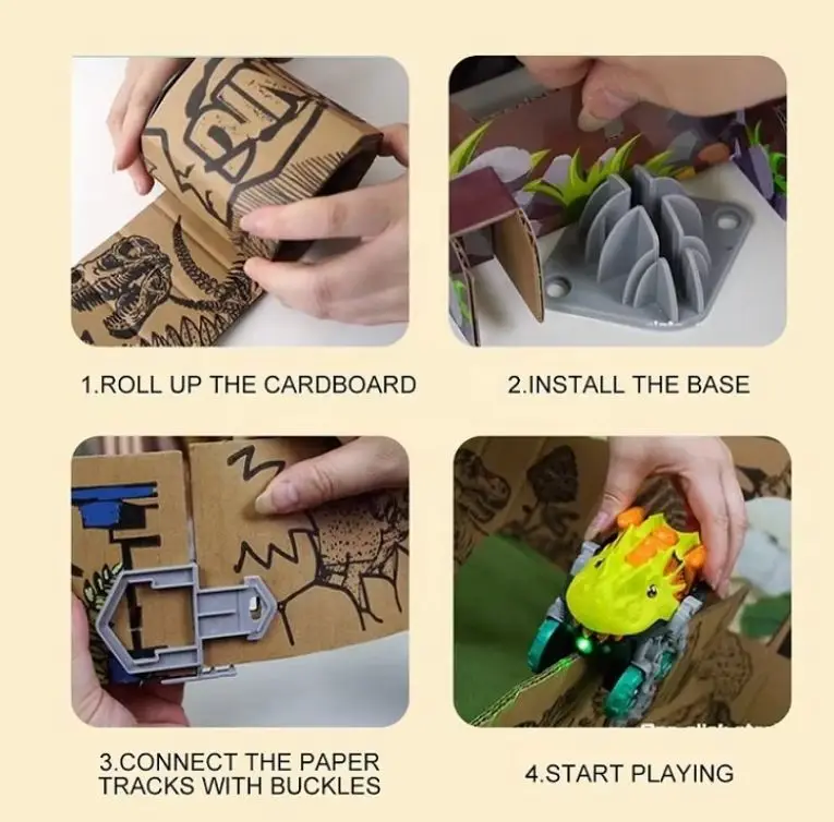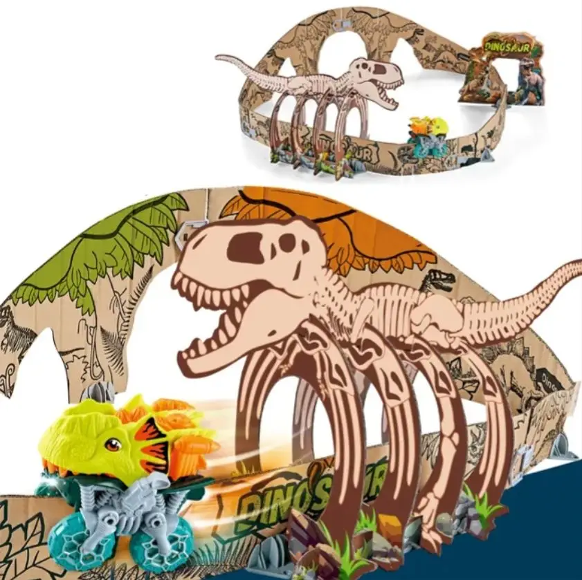 ITTL DIY Graffiti Handmade Assembled Paper Board Play Set Electric Light Rail Car Dinosaur Drawing Cardboard Track Toys for Kids