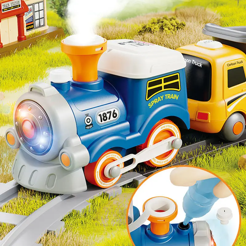 ITTL RC Cartoon Track Train Toy Smoke Railway Rail Kit Electric Steam Locomotive Engine Scene Track Set Light Sound Toy for Kids