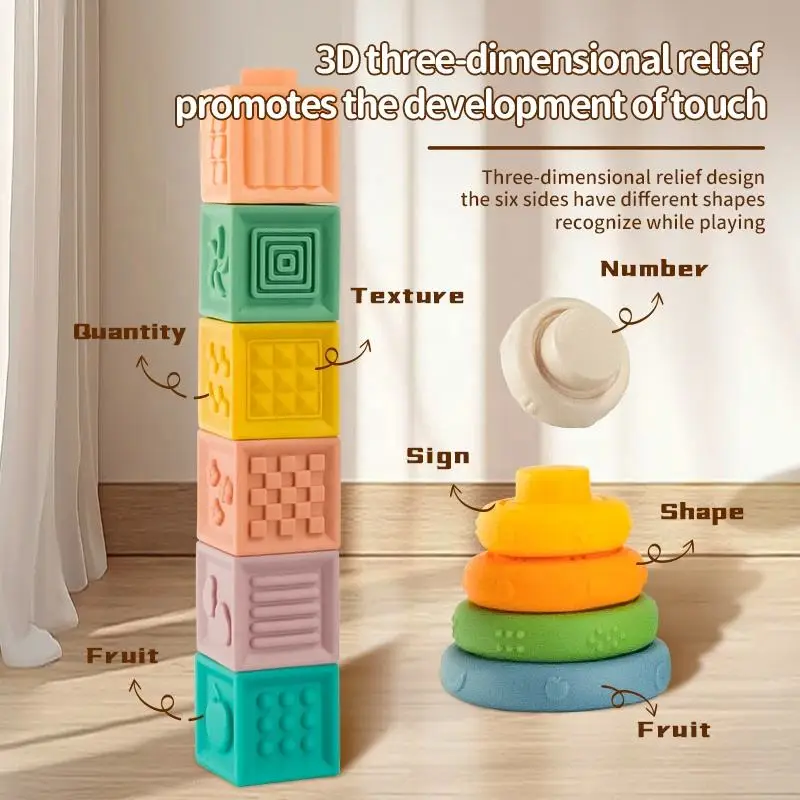 ITTL Baby Early Education Montessori 6 in 1 Infant Soft Rubber Sensory Training Stacking Toy Set With Storage Box Toys for Kids