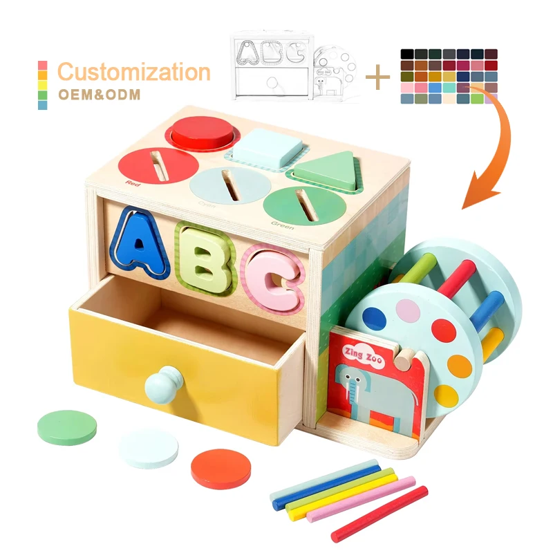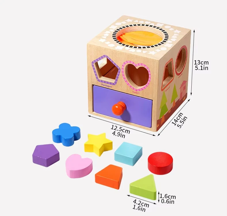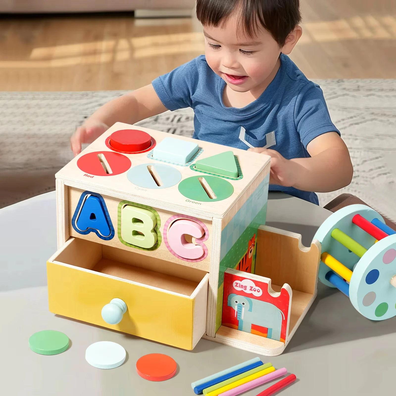 Montessori Wooden Coin Box Geometric Drawer Game Preschool Training Drum Shape Cognitive Matching for Early Learning