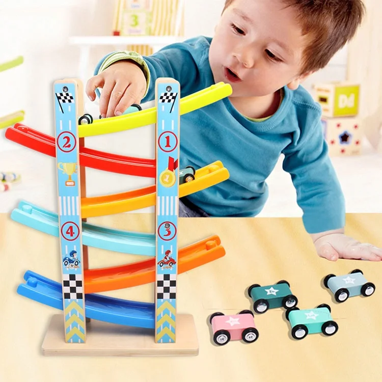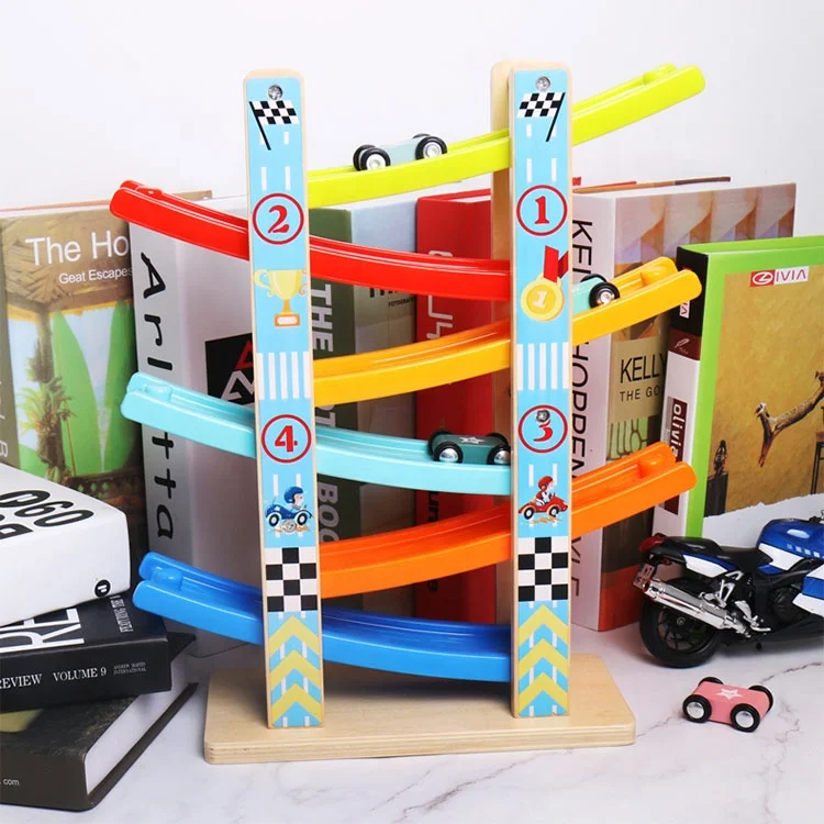 4 Rail Slide Model Wooden Ramp Race Glider Rail Car Toy Multi-layer Glider Wooden Race Track Car Ramp for Kids