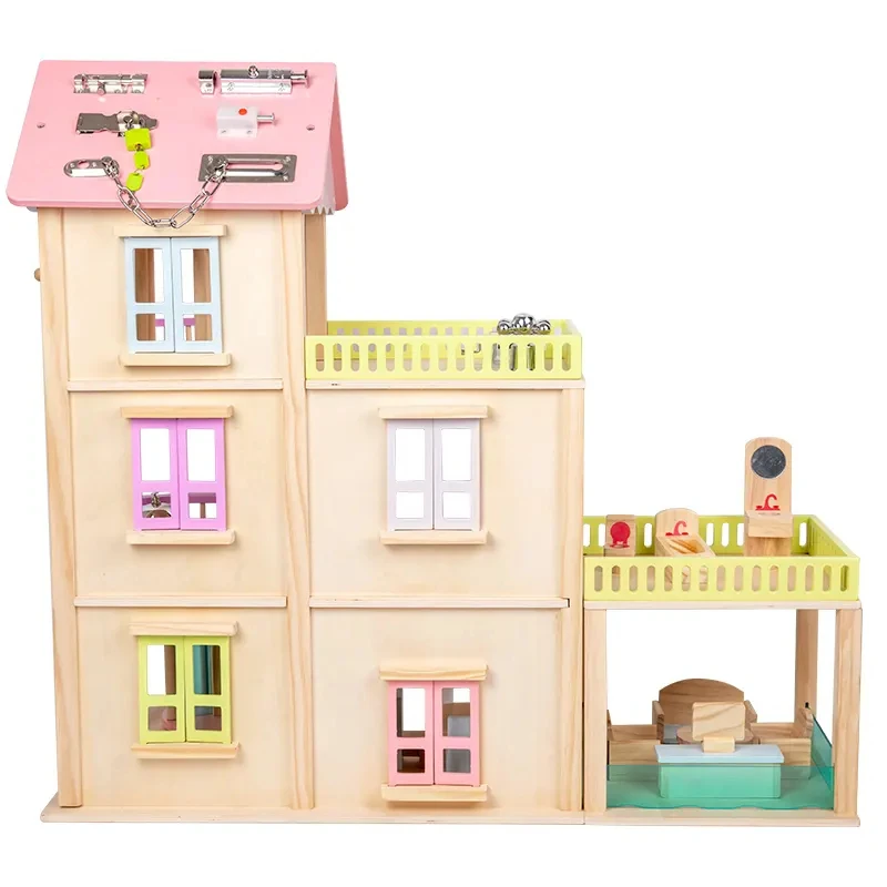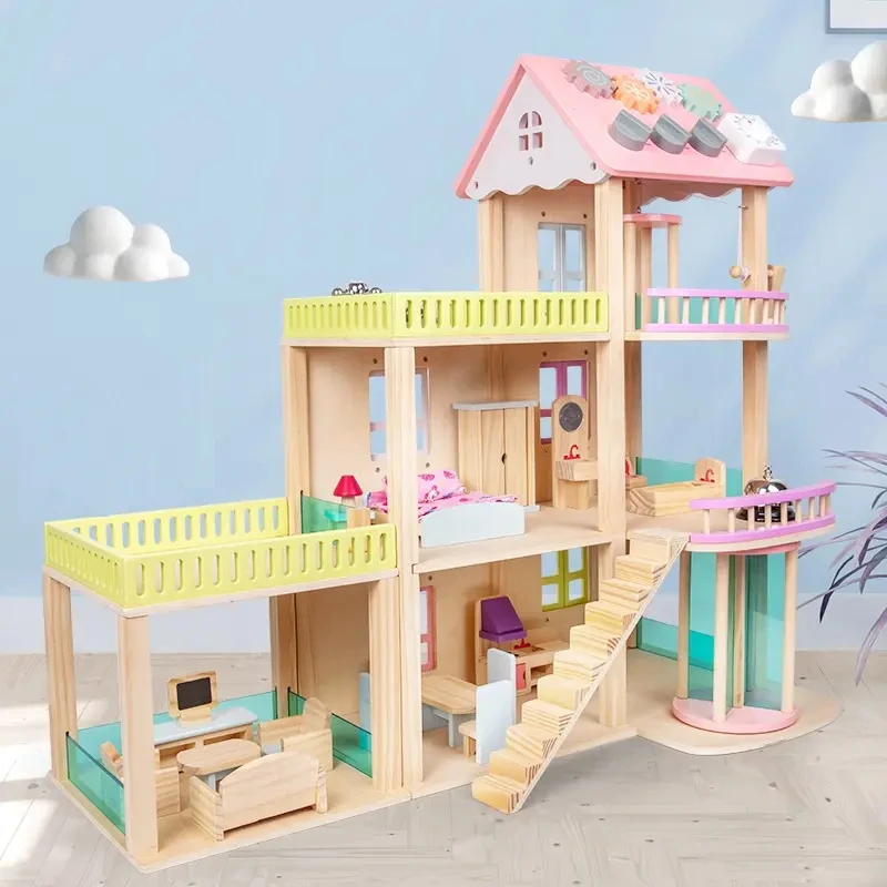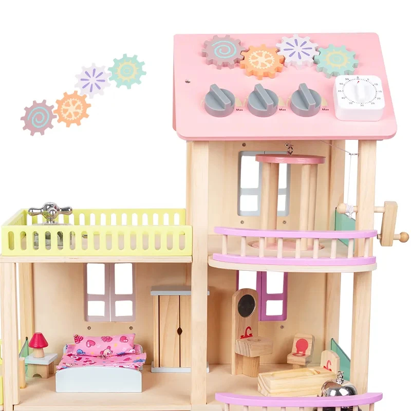 Children's Wooden Classic 3 Floors Pink DIY Elevator Princess Doll House Pretend Role Play Game Educational Gift Toys for Girls