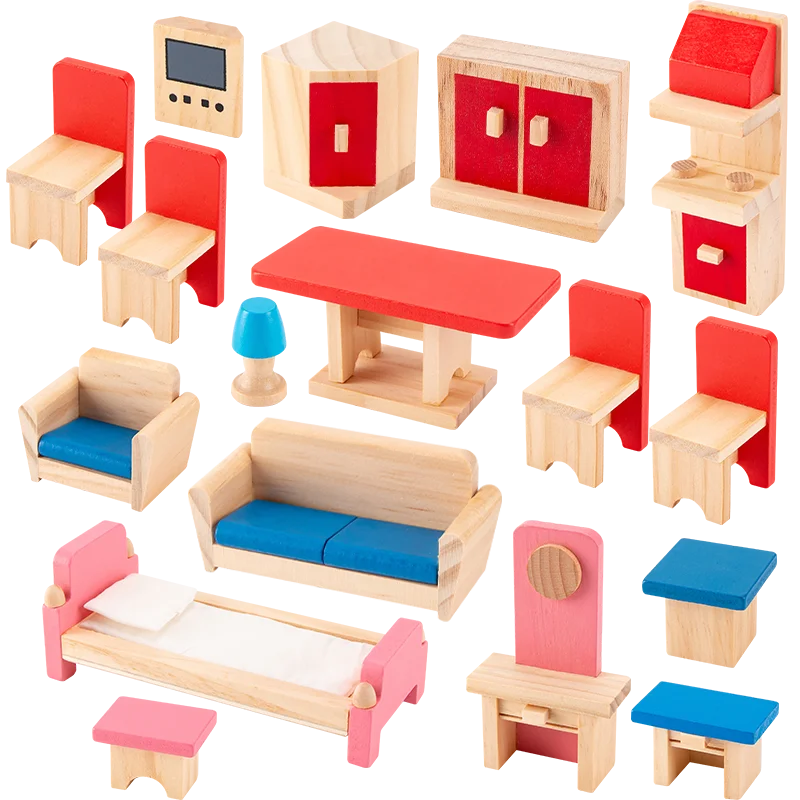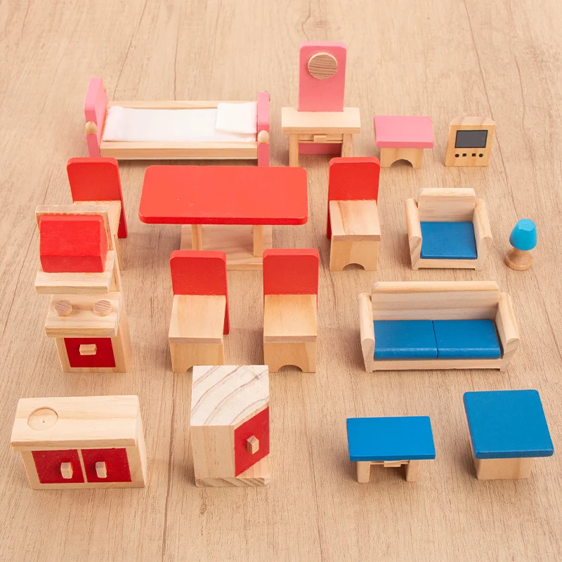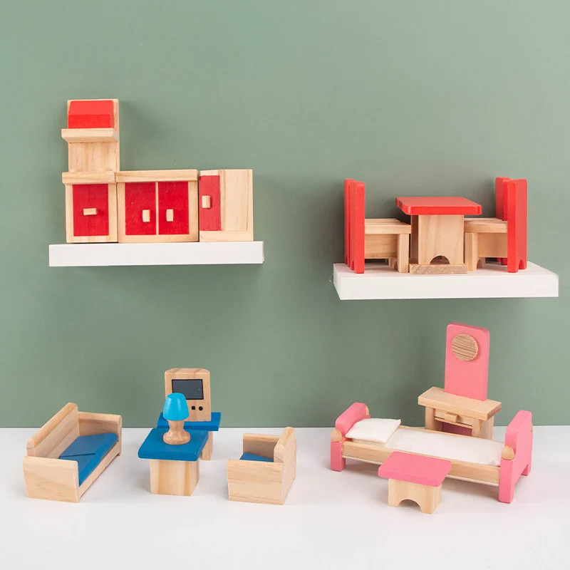Unisex Small House Wooden Furniture Pretend Play Set Educational Preschool Toy with Color Box Packaging