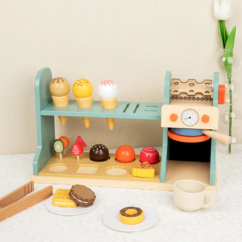 Wooden Kids Coffee Maker Ice Cream Dessert Pretend Play Set Food Kitchen Accessories Wooden Role Pretend Play Toys for Girls Boy