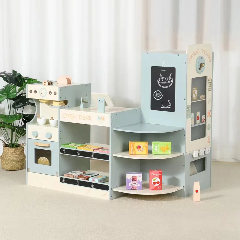 Kids Wooden Grocery Store Play Set Kids Play Store Wooden Supermarket Play Set with Cash Register Coffee Vending Machine