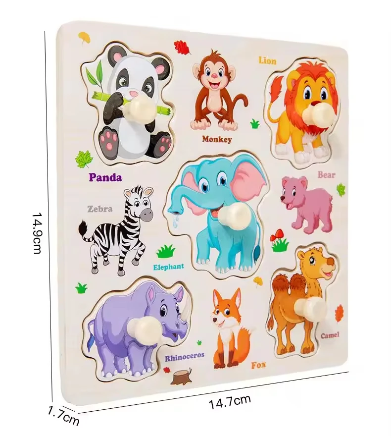 Wooden Peg Knob Hand Grasp Matching 3D Puzzle Board Child Educational Alphabet Cartoon Dinosaur Jigsaw Toys for Kids Boys Girls