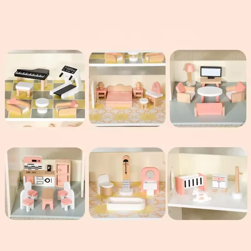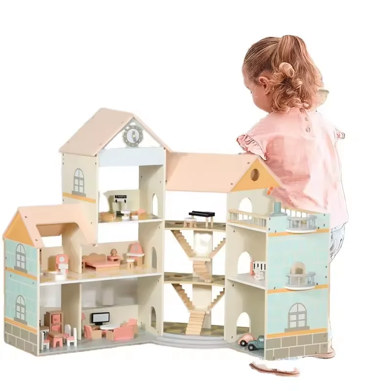 Popular Simulation House Role Play Game Toy Wooden Princess Doll House Mini Children Three-story Playroom