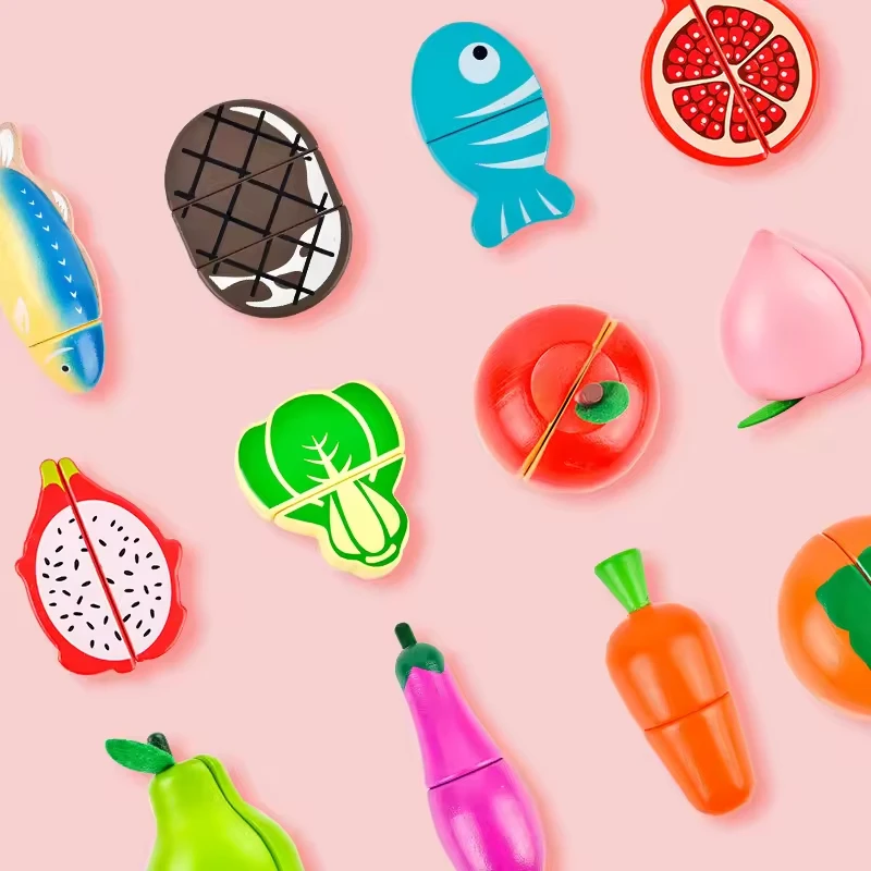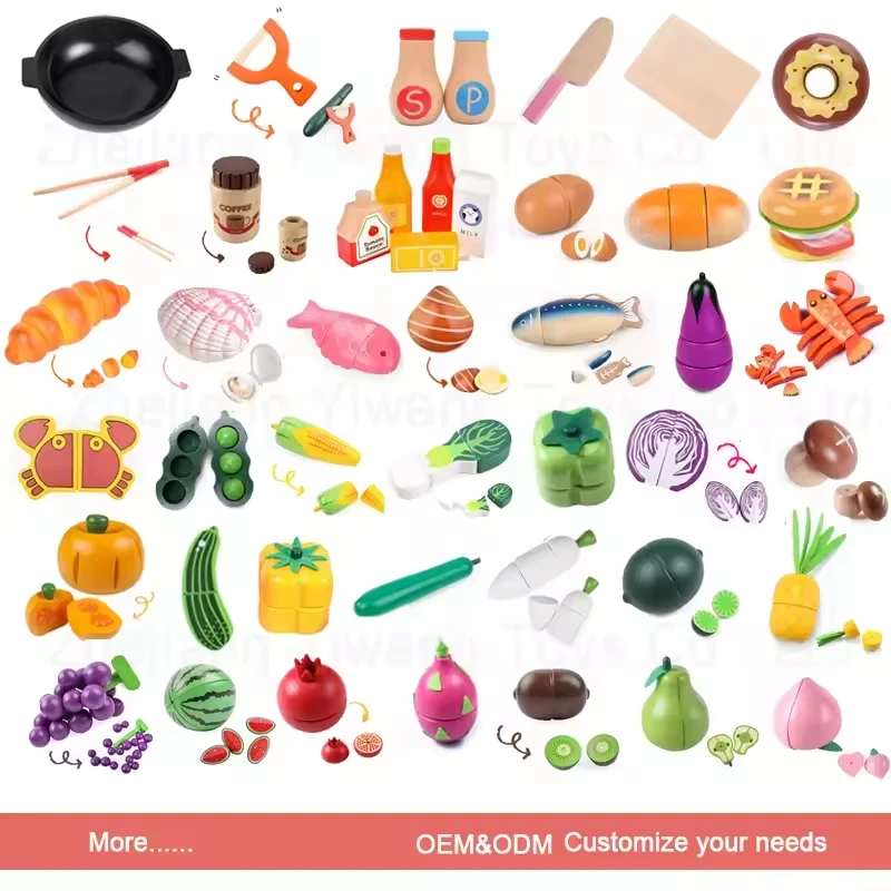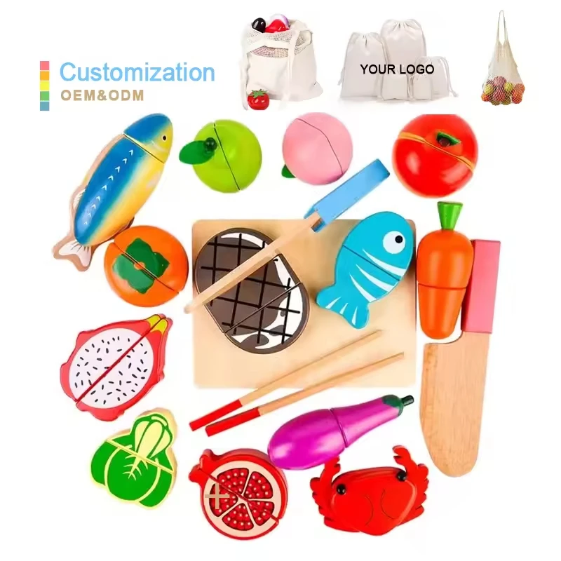 Costom Wooden Play Food Velcro Fruit and Vegetable Cutting Set for Kids Pretend Food Play Kitchen Accessories Toy Gift