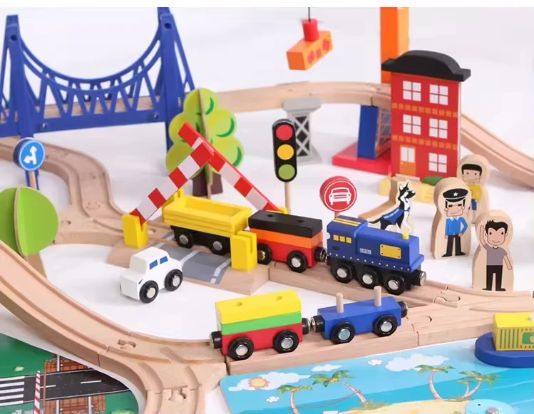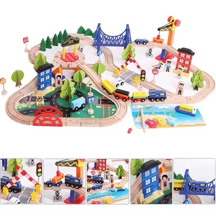 Custom Multifunctional Fishing Educational Classic Railway Toys 108pcs Wooden Train Set with Tracks & Accessories Children Train