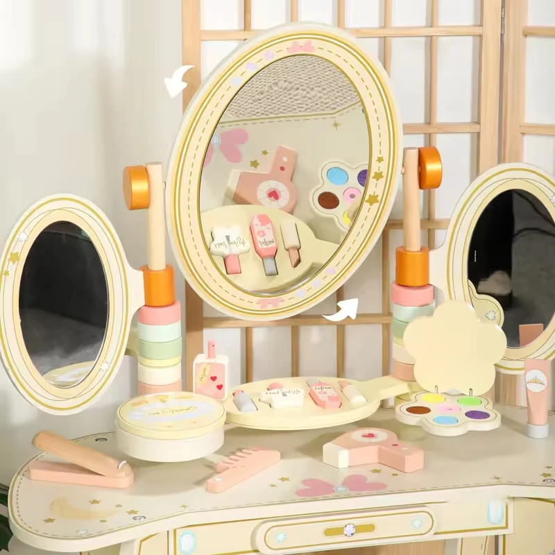 Best-Selling Wooden Makeup Table Three Mirror Dresser Early Educational Pretend Play Preschool Beauty Fashion Toys for Kids