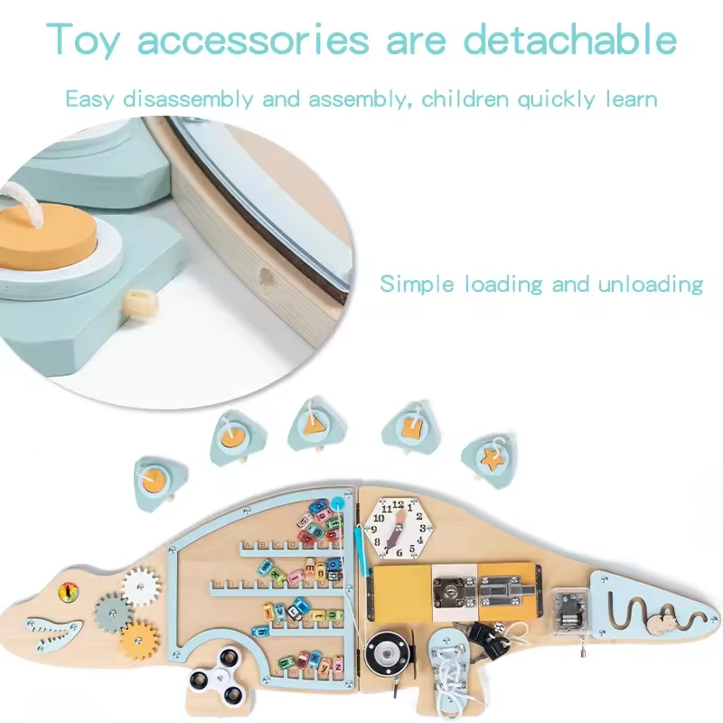 Multi-Functional Sensory Busy Board Educational Toy for Kids Wooden Dinosaur Shape Wall Game Activity Center with Gears Locks