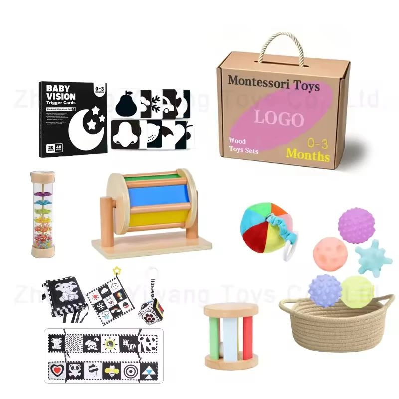 6 in 1 Early Education Box Montessori Wooden Toy Tissue Box Rain Stick Spinning Drum for Baby 0-6 Months for Kids Boys Girls