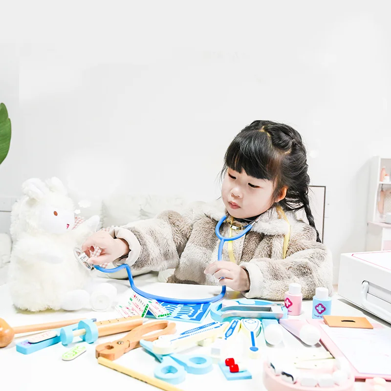 Montessori Wooden Mock Medicine Kit Doctor Nurse Injection 42 Pcs Dentist Tool Educational Learning Toys for Kids Boys & Girls