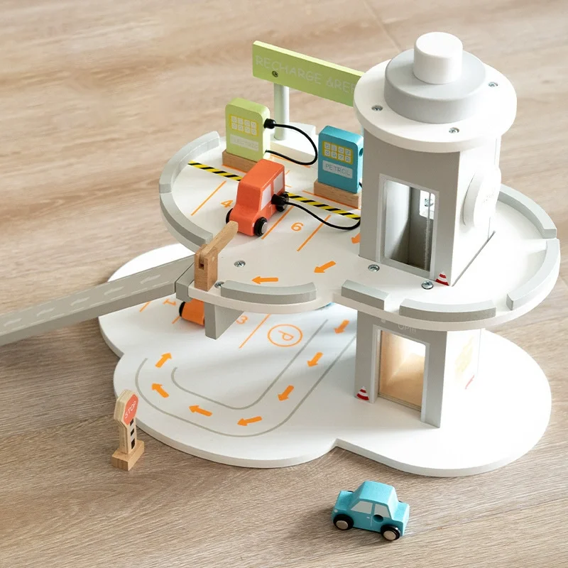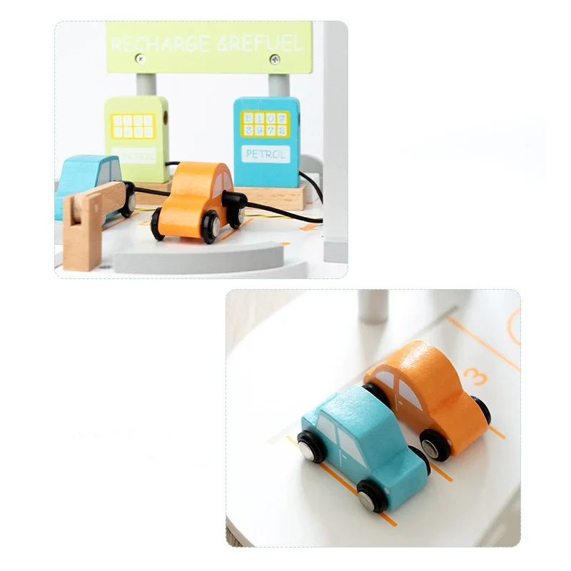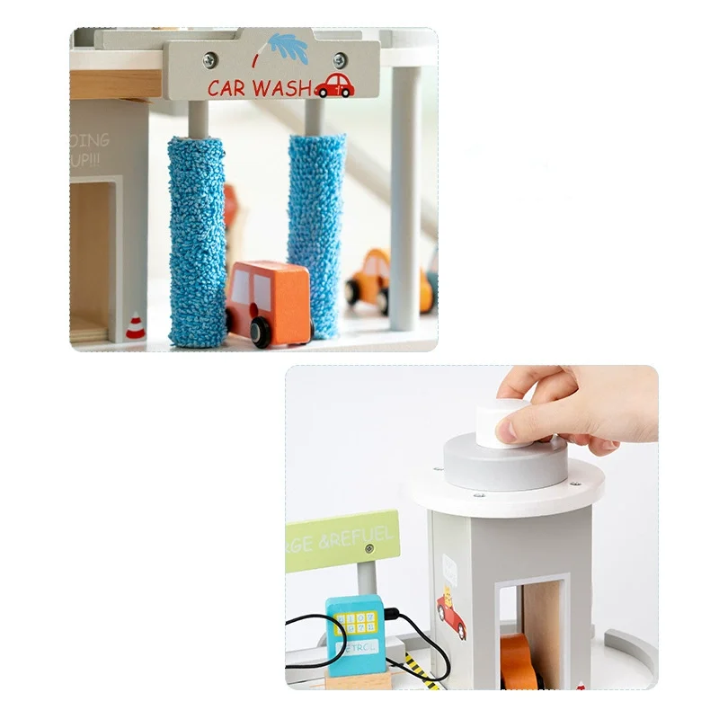 Best-selling Pretend Parking Lot Double Deck Simulation Transportation Gas Station Wooden Vehicle Toy for Kids Boys & Girls