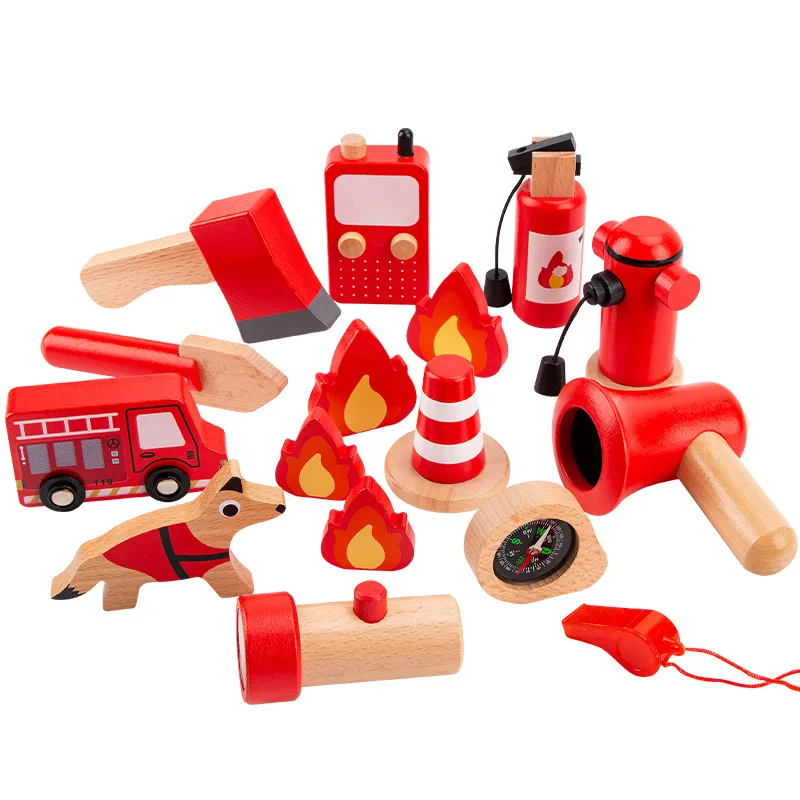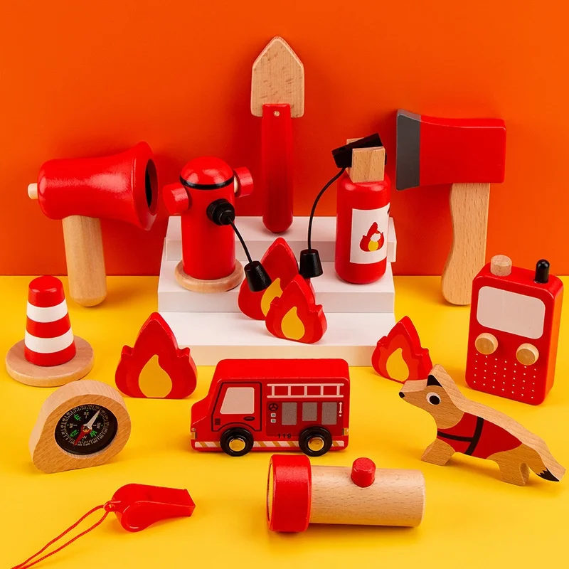 Unisex Wooden Firefighting Pretend Play Set Simulation Fire Truck Tools Interactive Cognitive Educational Learning Toys for Kids