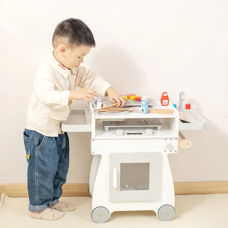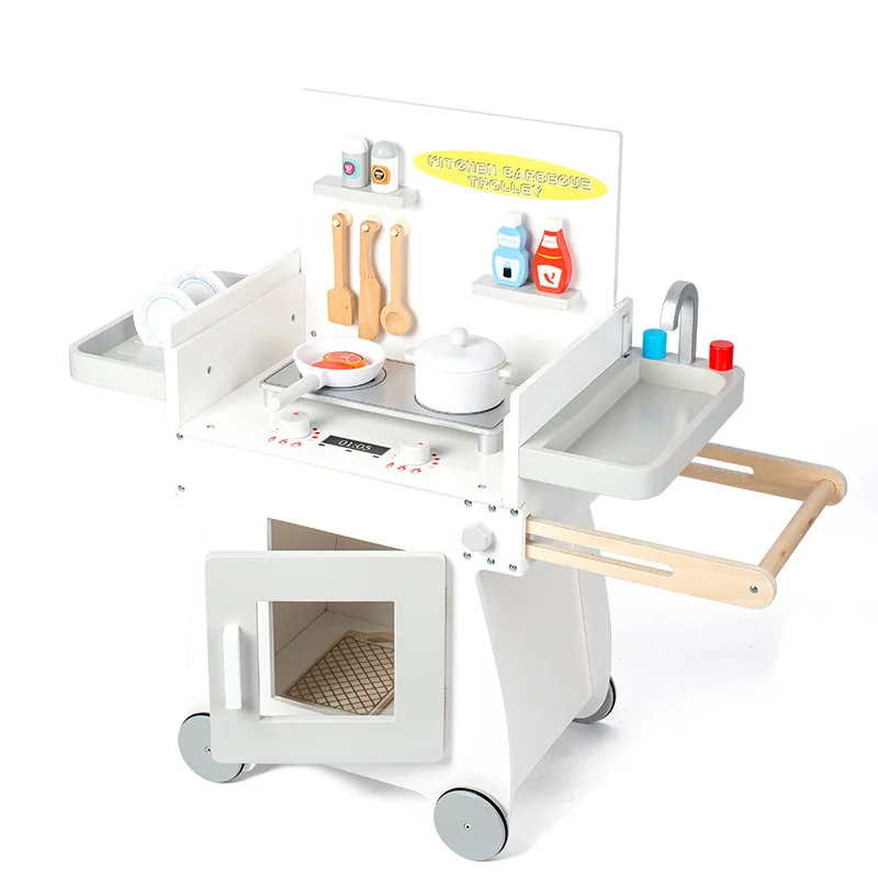 Best-selling Wooden Kitchen Bbq Cart Kitchen Commissary Cashier Interactive Educational Learning Toys for Kids Boys & Girls