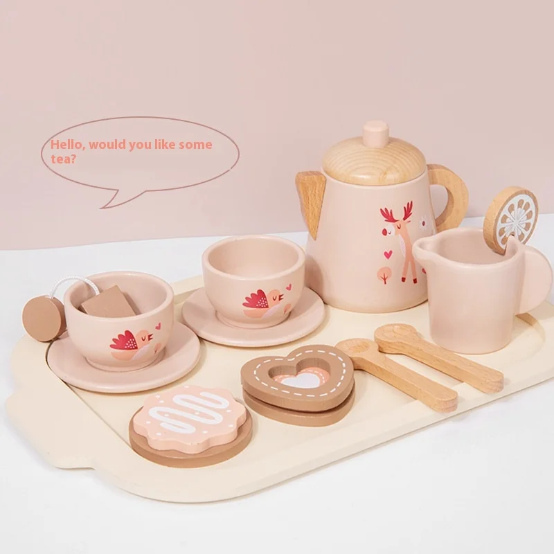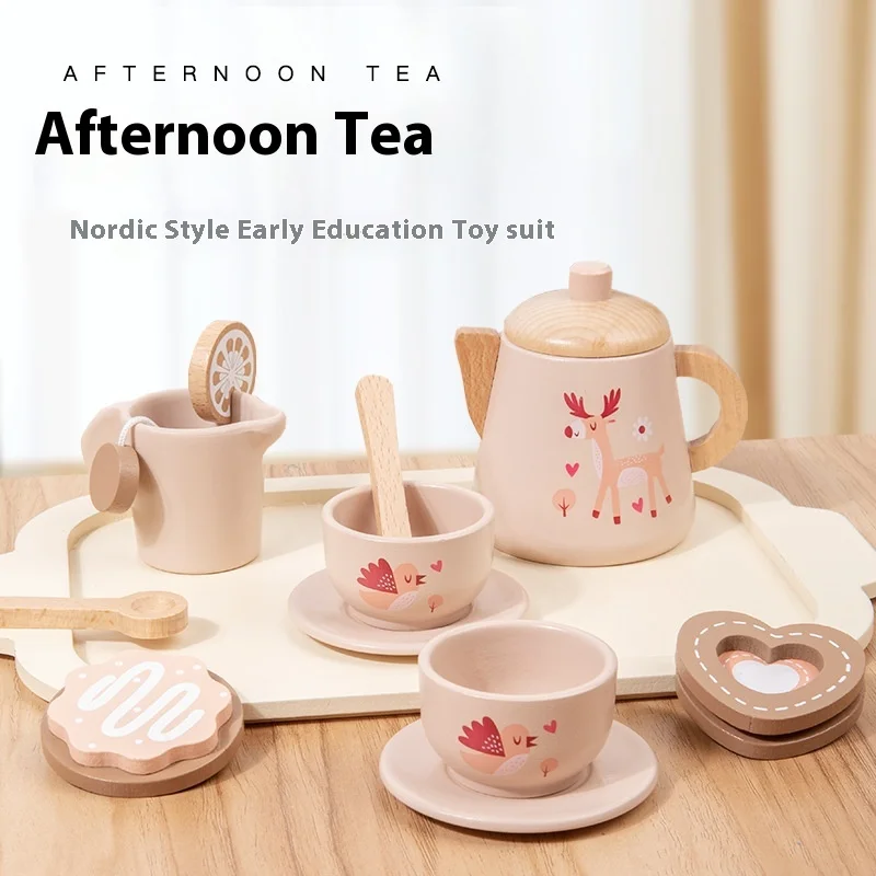 Montessori Wooden Tea Set Artificial Afternoon Dessert Teapot Tableware Educational Learning Toys for Kids Toddler Boys & Girls