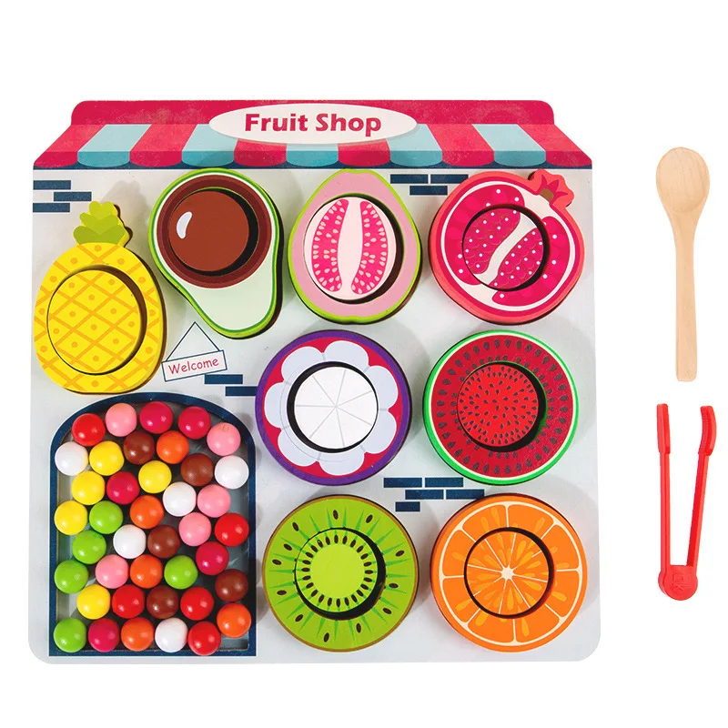 Hot Sell Wooden Simulation Fruit Building Block Exercise Baby Hand Eye Coordination Color Classification Educational Toy for Kid