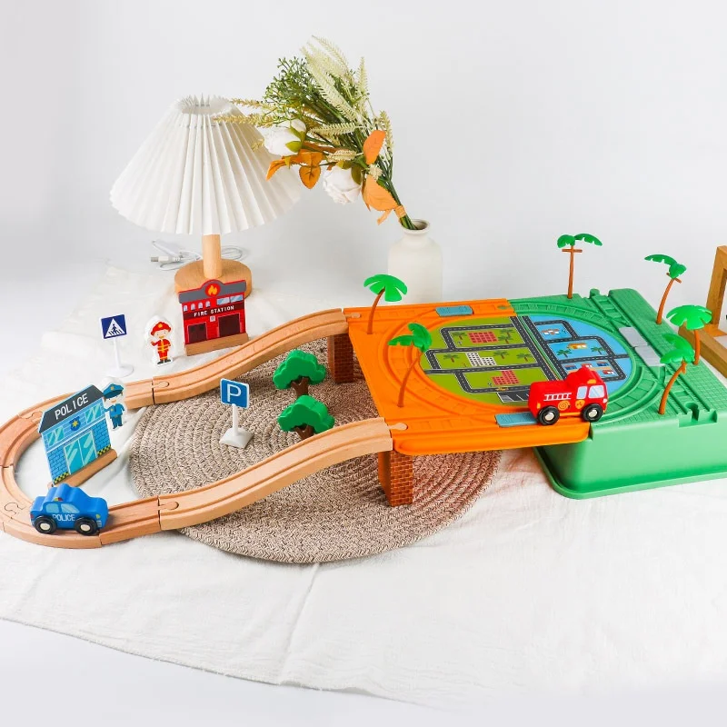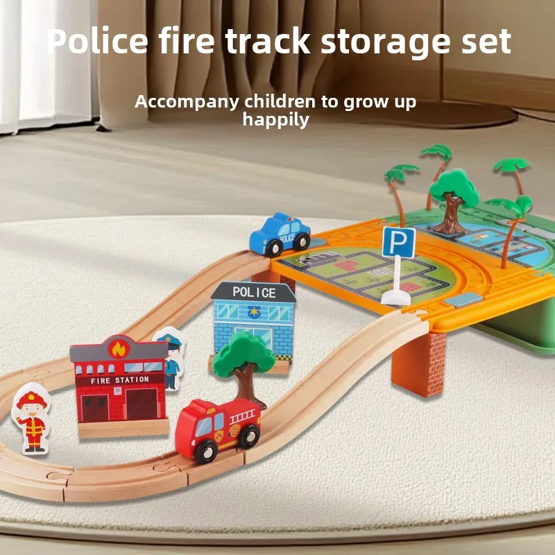 New Design Wooden Police Fire Track Box Storage Assembly Train Educations Toy Storage Box Creative for Kids Toddler Boys & Girls