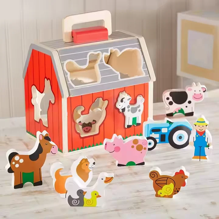 Multi-functional Farm Animal Matching Shape Color Sorting House Stacking Blocks Wooden Sorting Educational Learning Toys for Kid