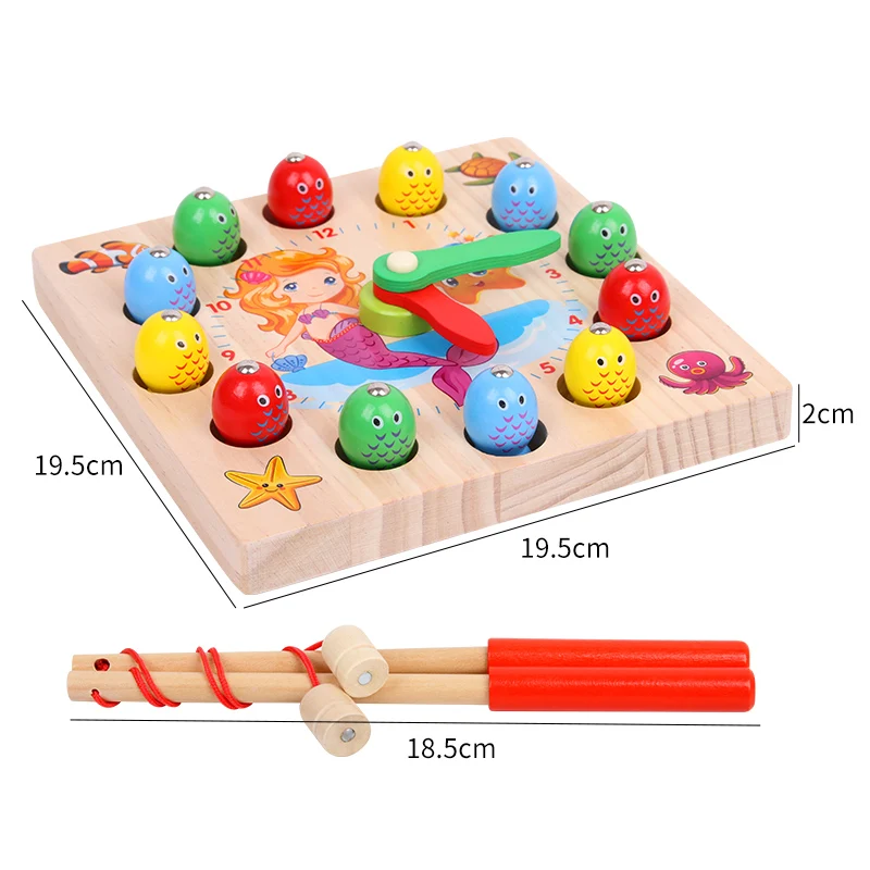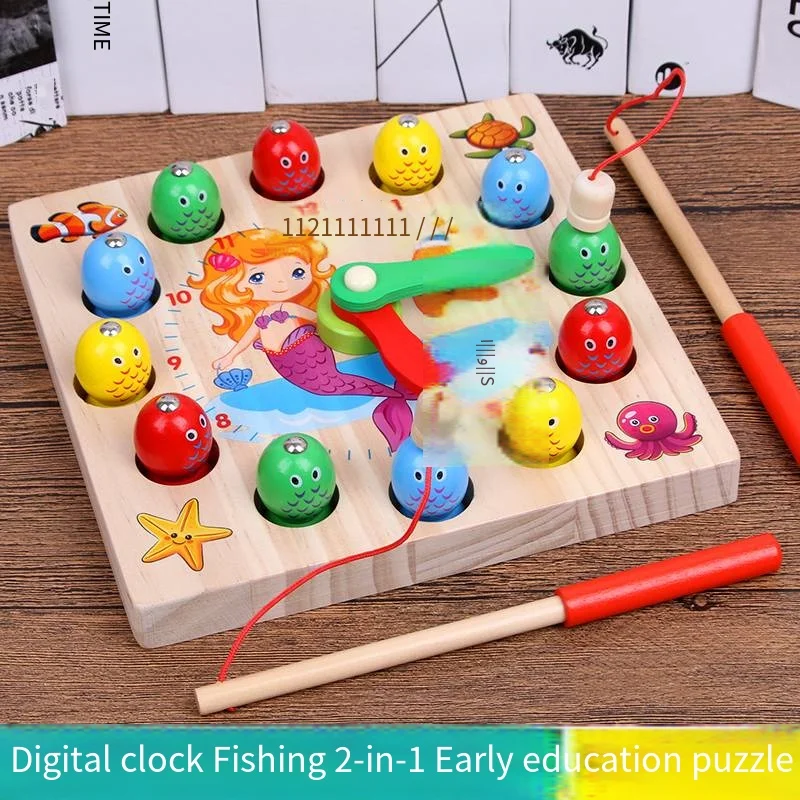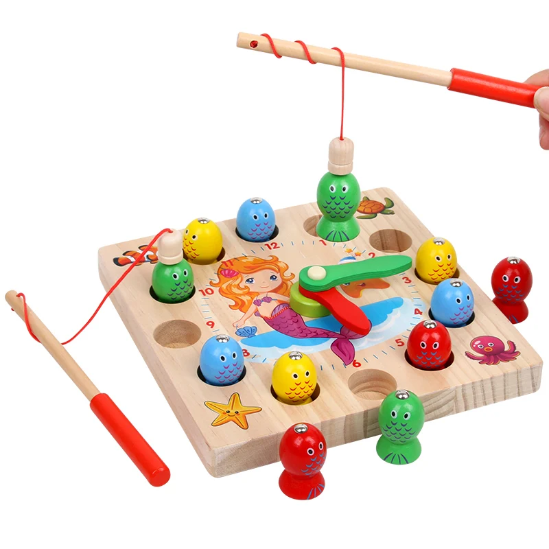 Montessori Educational Early Learning Fish Catching Game Time Learning Pre-school Age Child Wooden Clock Interaction Toys
