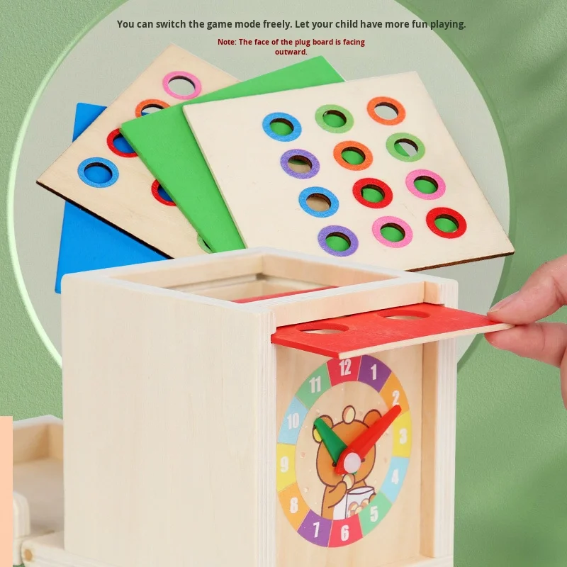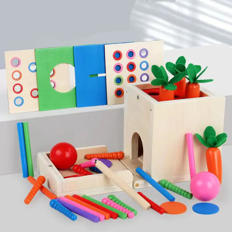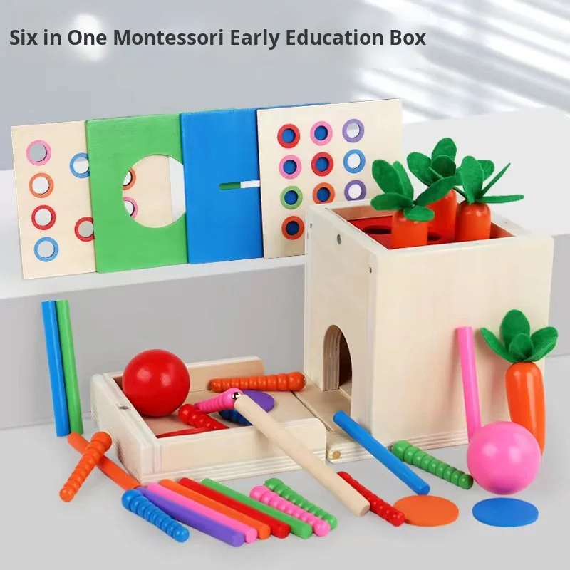 Kids Montessori Wooden Coin Box 6 in 1 Learning Toy with Radish Pulling Color Matching and Building Blocks Developmental Toys