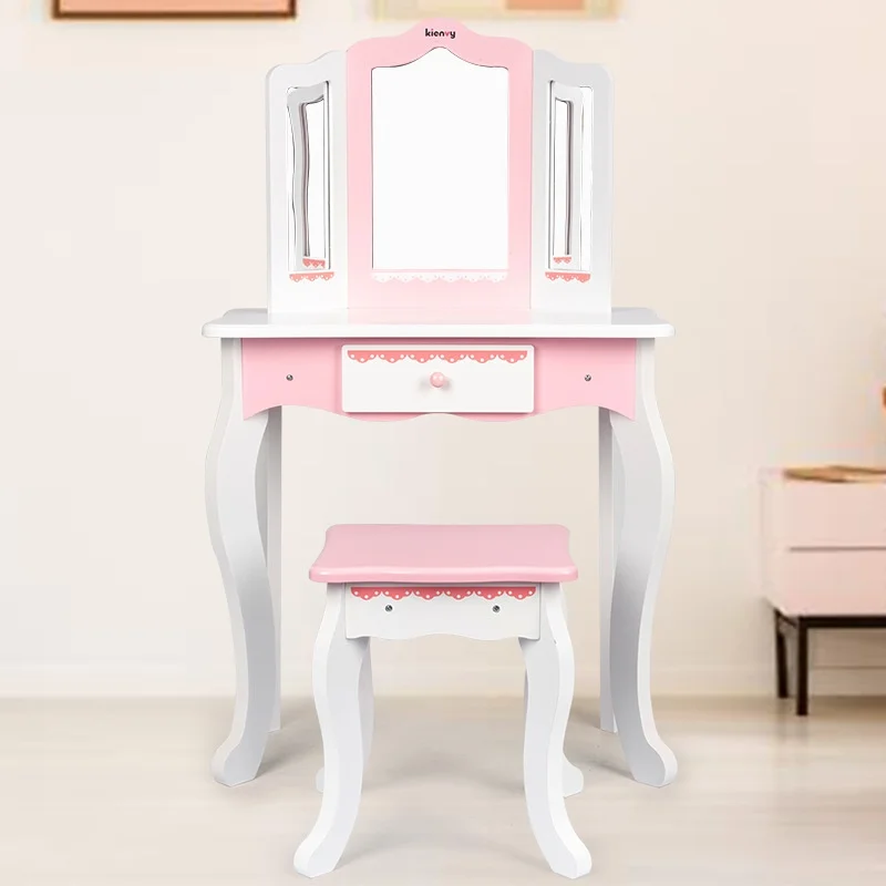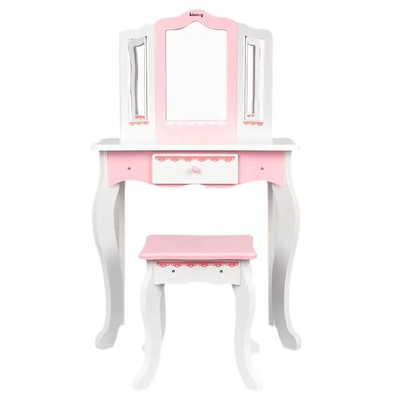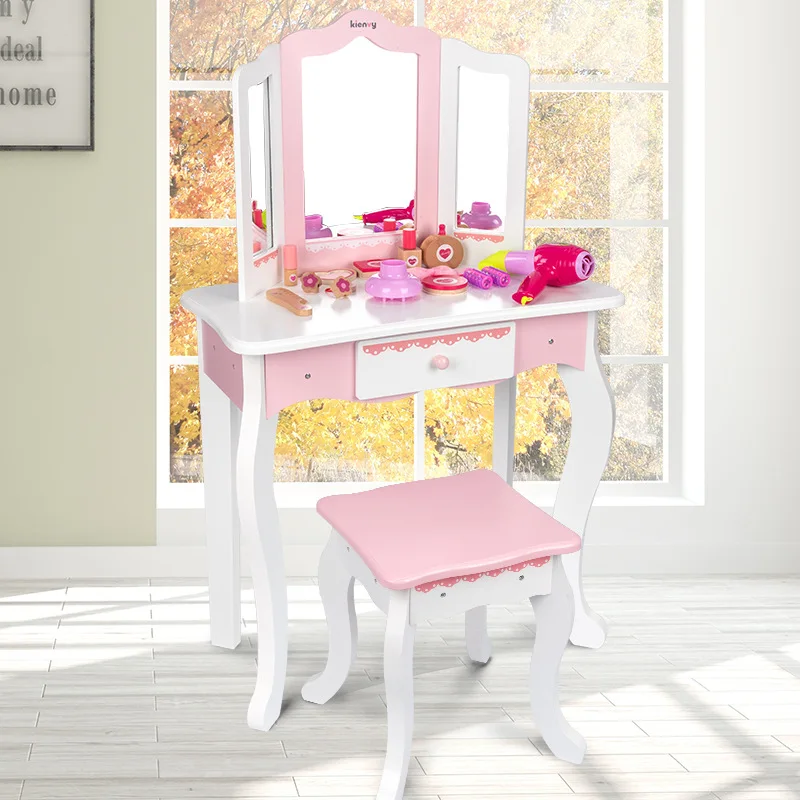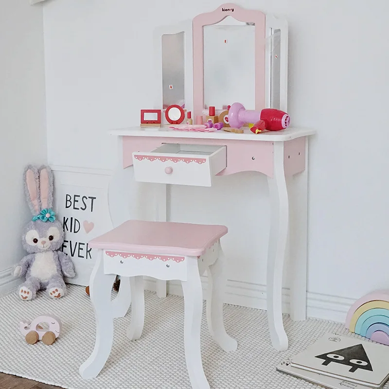 Princess Wooden Makeup Dressing Table Toy for Kids Pretend Play Early Education Vanity Set with Mirror and Accessories