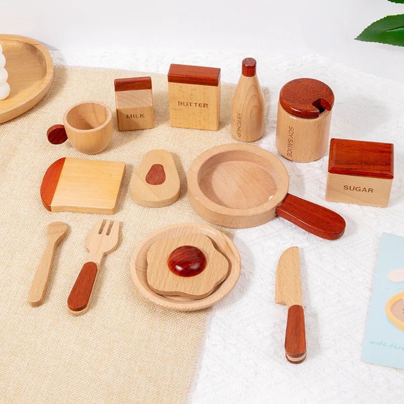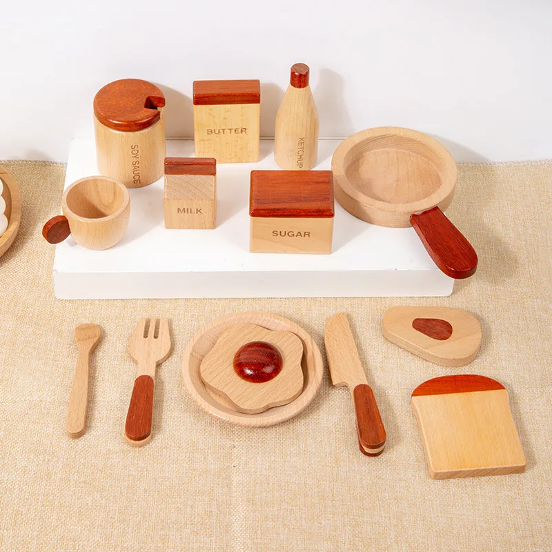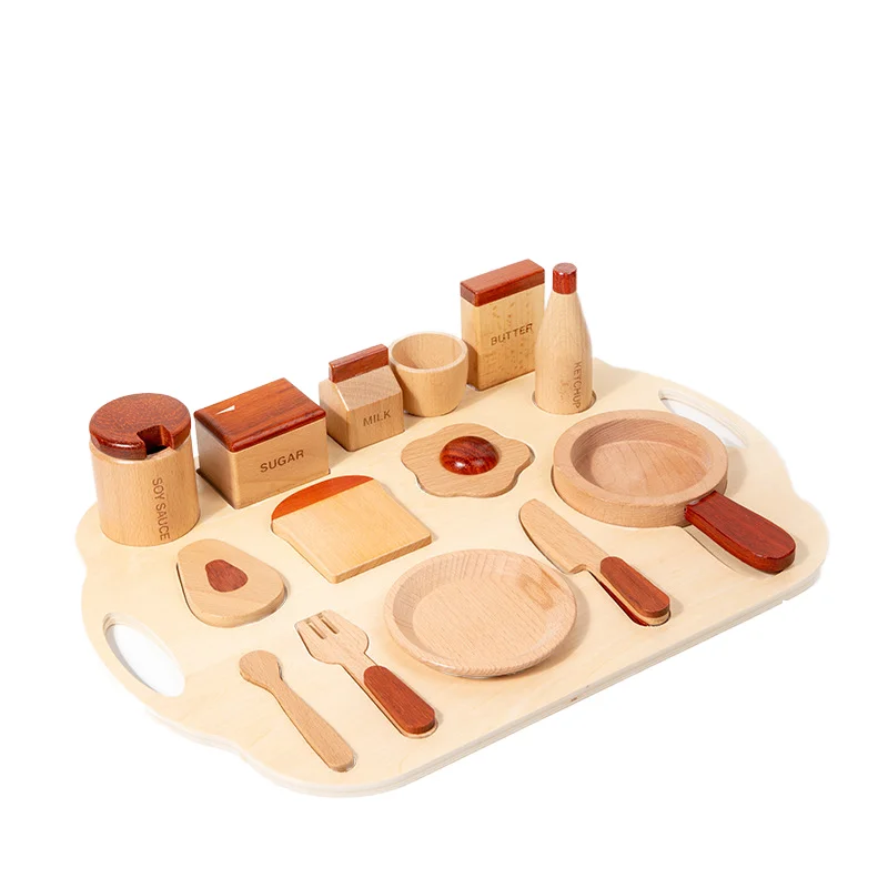 Educational Wooden Breakfast Kitchen Set for Kids Pretend Cookware Tray and Simulated Utensils for Fun Role Play