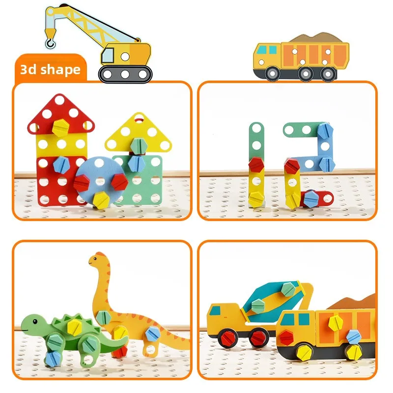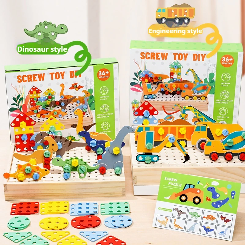 Wooden Dinosaur Construction Truck Screw Puzzle Toy for Kids Montessori Early Learning Fine Motor Skills Training