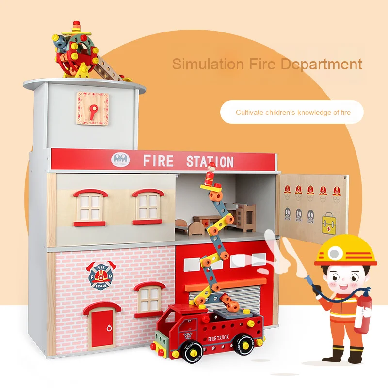 Large Interactive Wooden Fire Station Playhouse Educational Toy for Children and Babies Role Scene Play Gift
